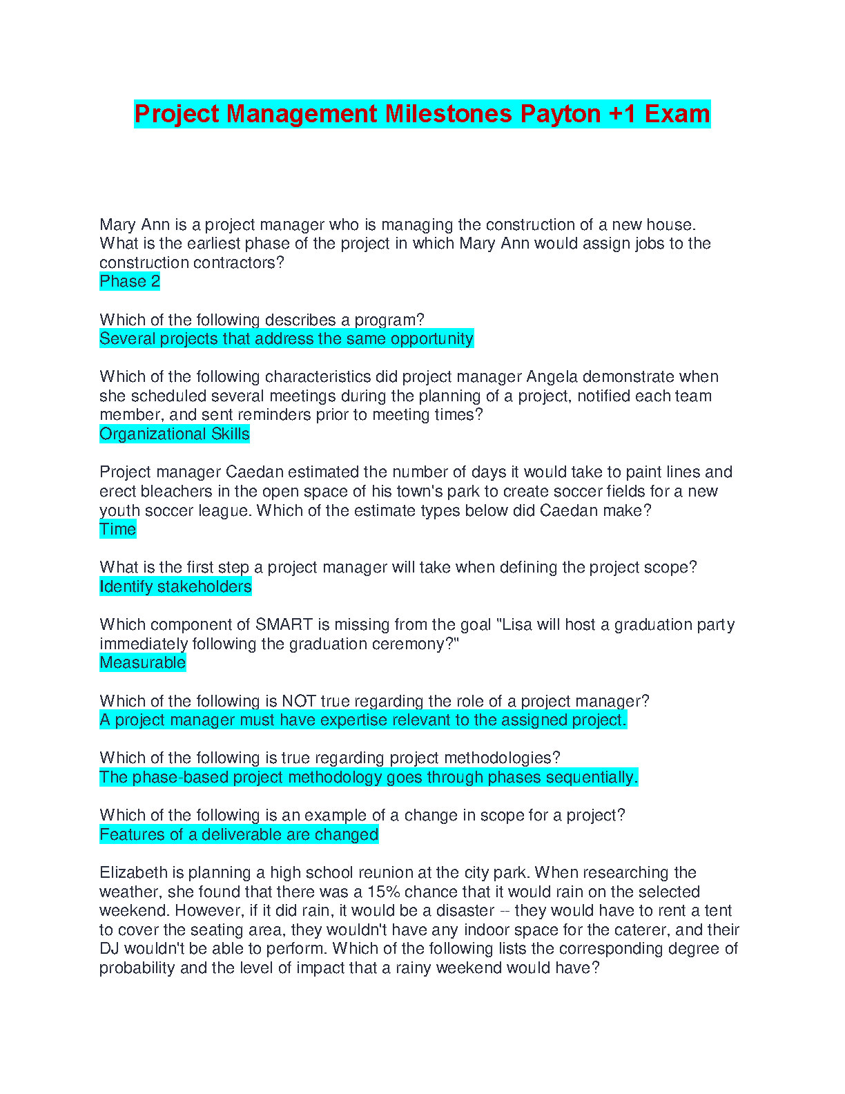 This comprehensive guide covers Project Management Milestones Payton +1 Exam questions, providing students with the knowledge and practice they need to pass their exams on the first try. Perfect for students aiming for exam success in the 2024-2025 academic year, this resource offers targeted exam preparation.