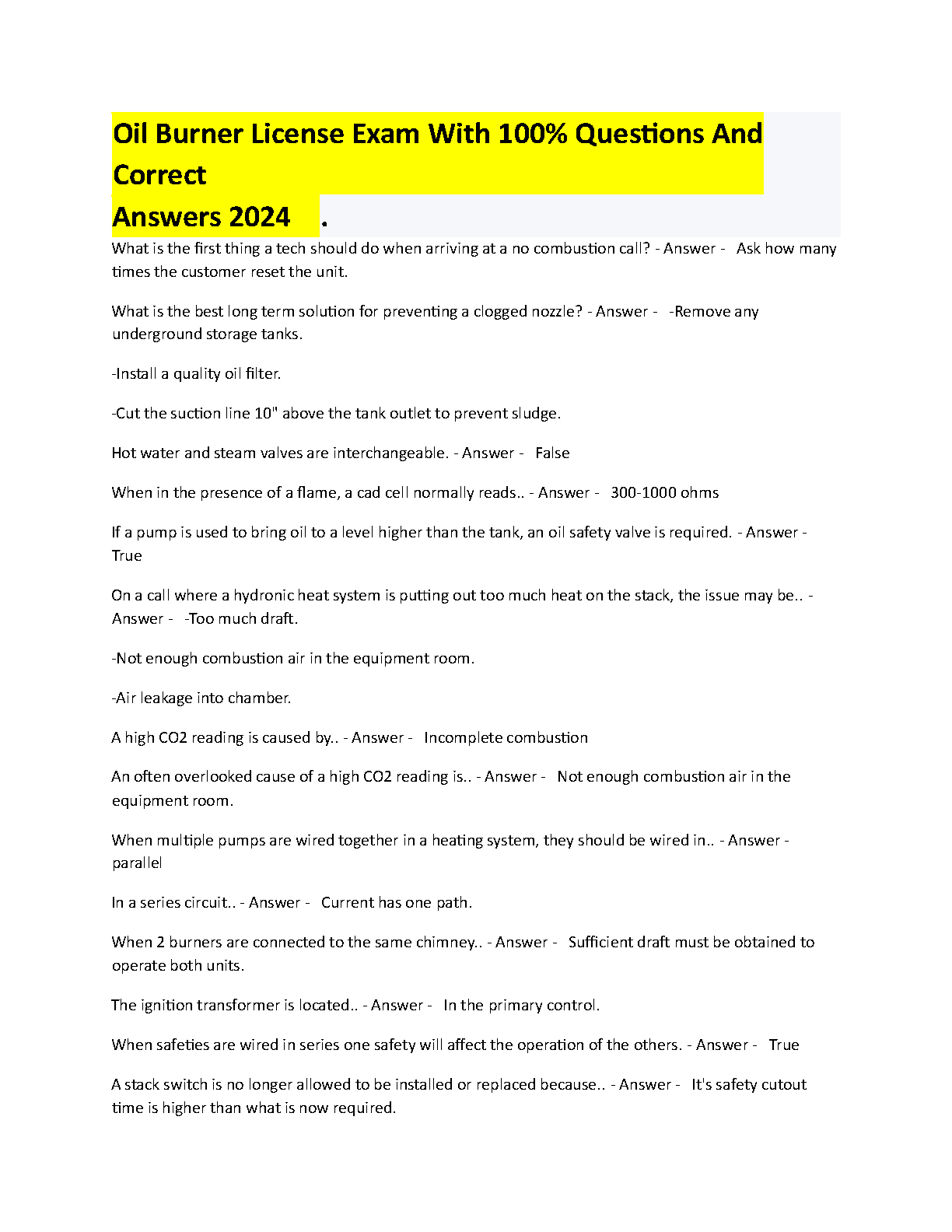 Ace your Oil Burner License exam with this comprehensive guide containing 100% correct answers to help you pass on your first attempt and avoid resits. Prepare...