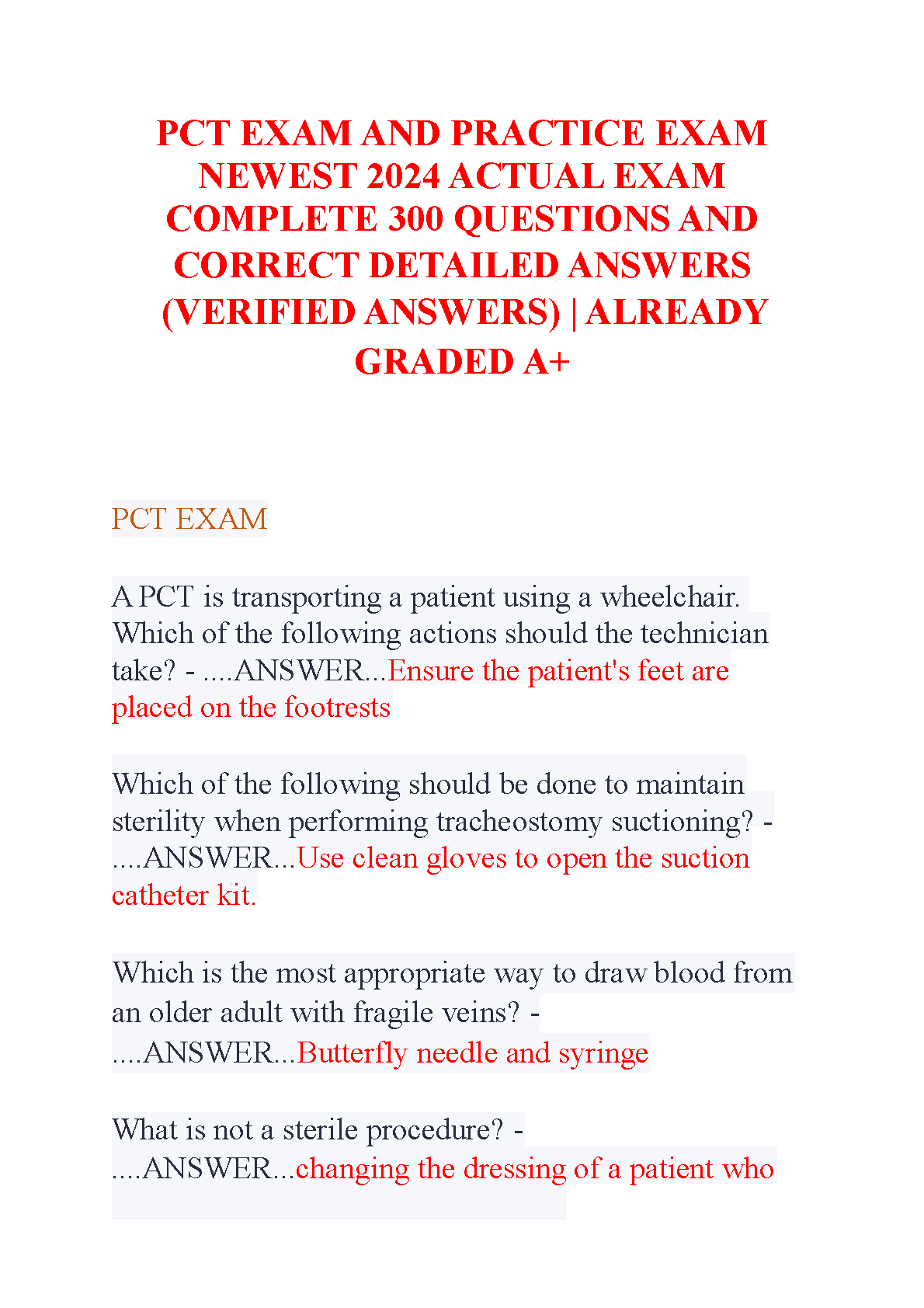 Ace your PCT exam on the first try with this comprehensive 2024/2025 study guide! This resource includes 300 practice questions and detailed, verified answers, ensuring you're fully prepared for exam day. Already graded A+, this resource guarantees success and helps you avoid resits.