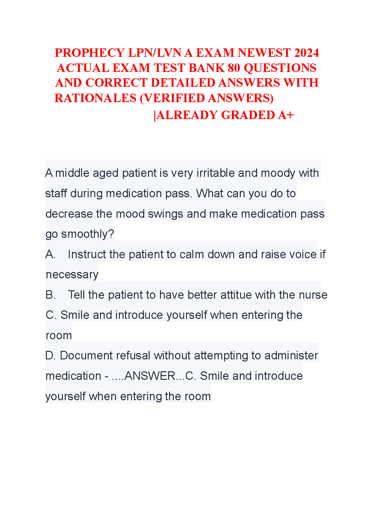 Ace your Prophecy LPN/LVN A exam with this comprehensive test bank featuring 80 detailed questions and answers, complete with rationales. These verified answers...