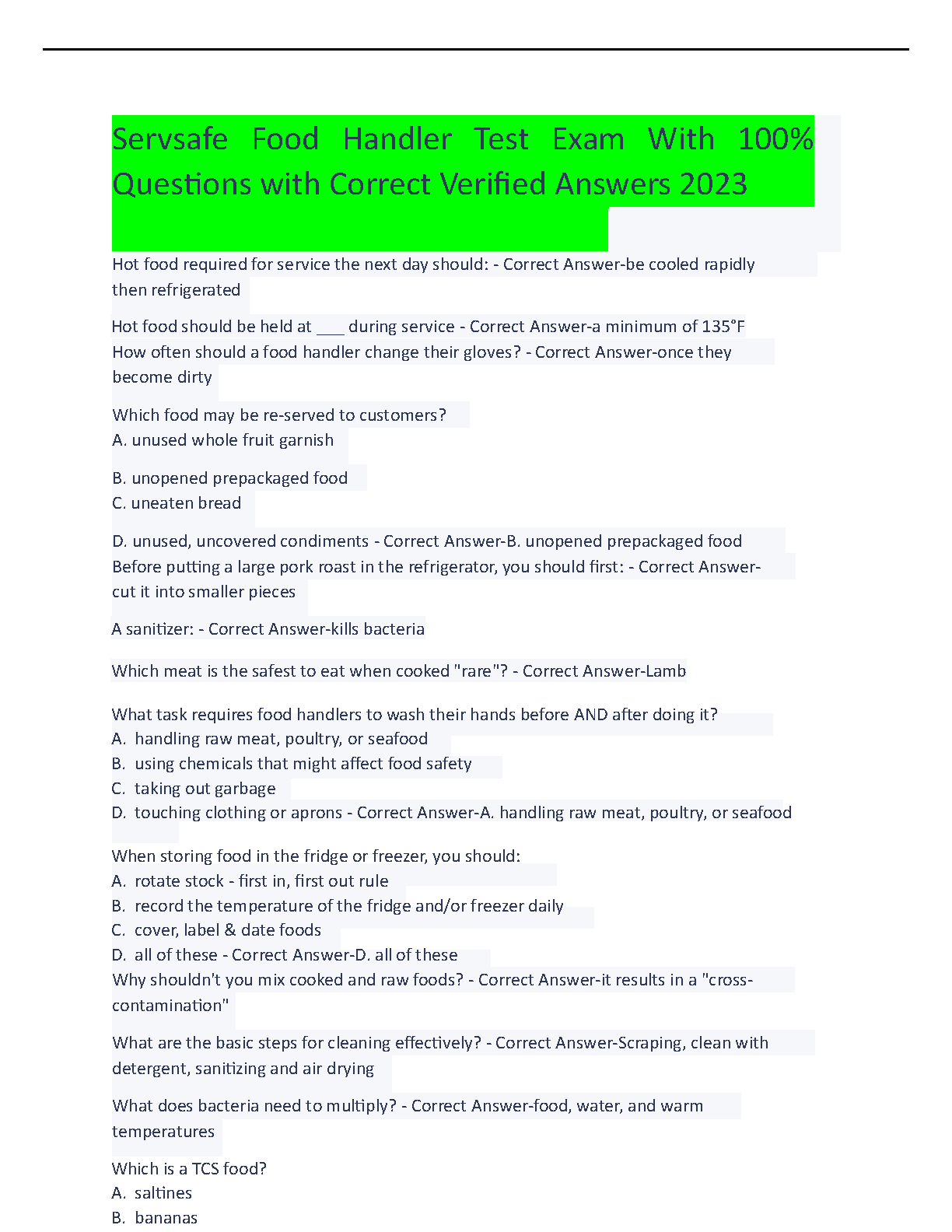 ServSafe Food Handler Exam 2023: Questions with Verified Answers by [Author Names]