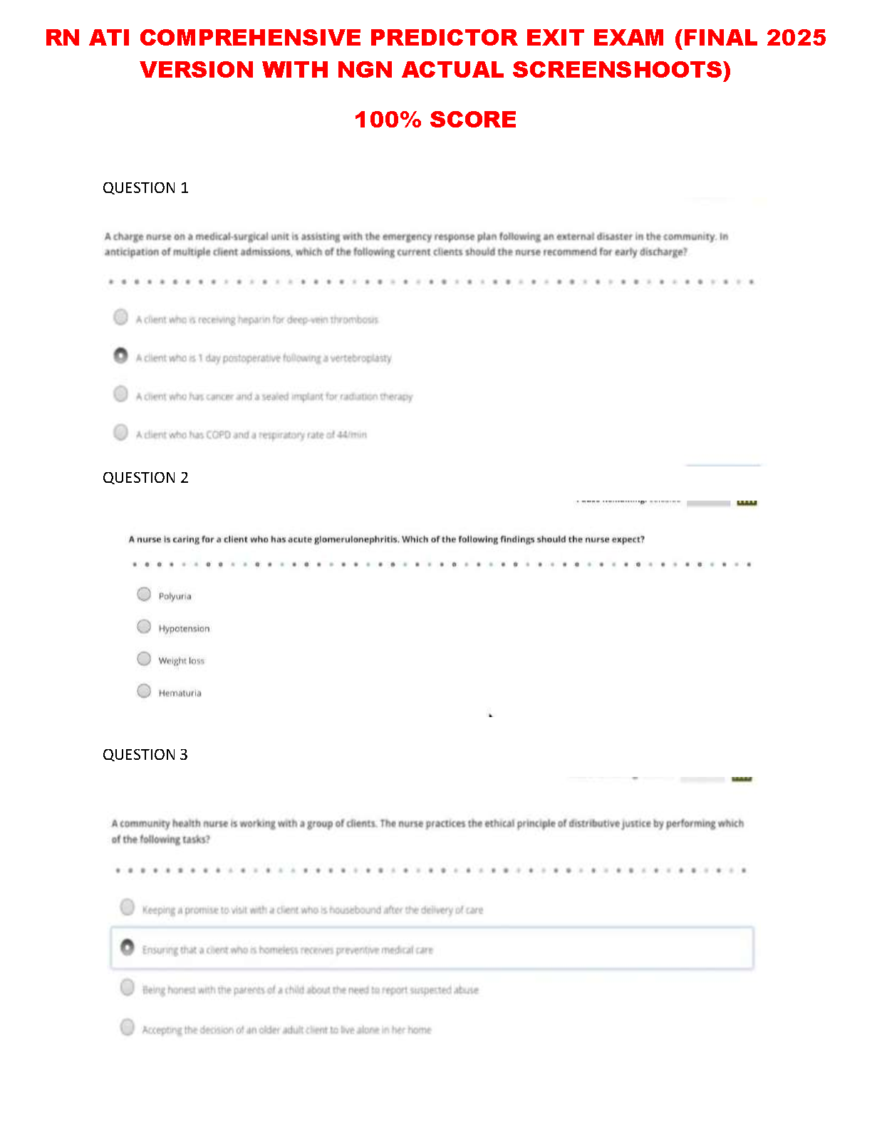 Ace your RN ATI Comprehensive Predictor Exit Exam with this 100% score version featuring actual screenshots from the NGN. This comprehensive study guide is perfect for nursing students aiming to pass their exams on the first attempt, avoiding resits for the 2024/2025 academic year.