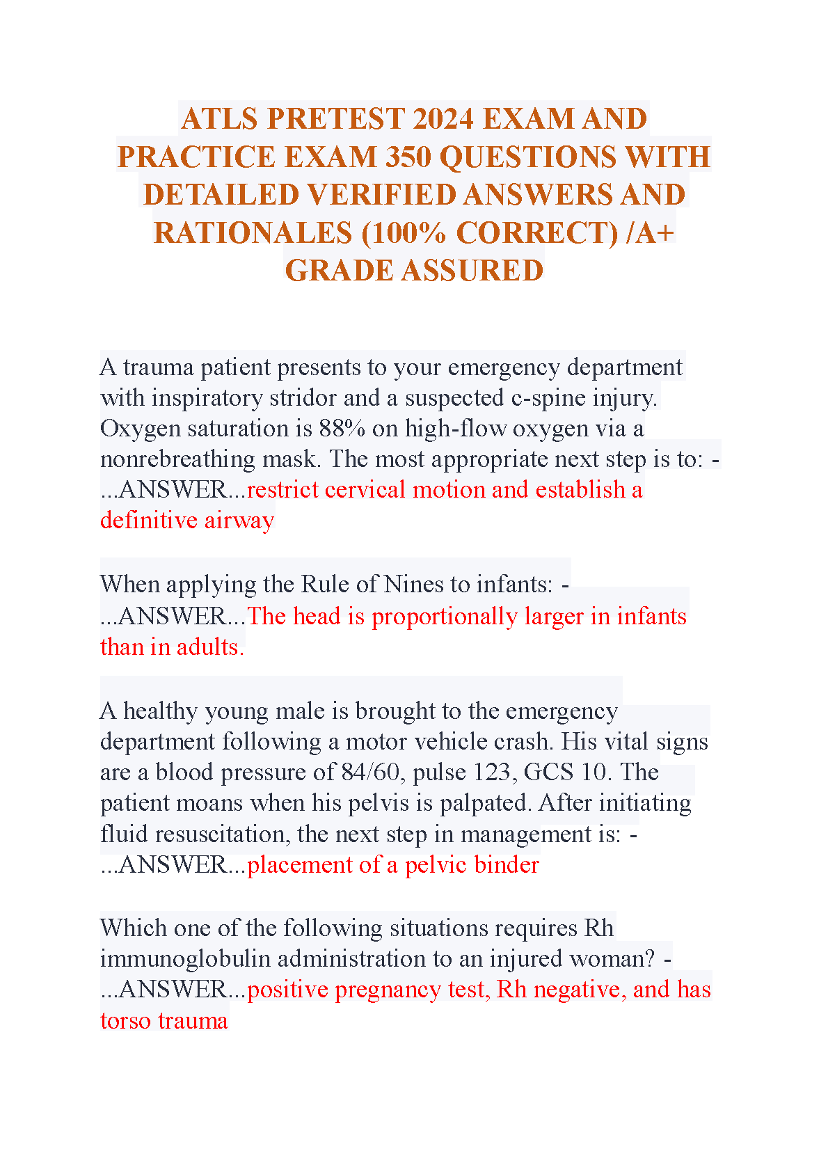 Ace your ATLS exam on the first try with this comprehensive 2024/2025 edition practice exam featuring 350 detailed questions, verified answers, and rationales. This resource provides everything you need to succeed and avoid resits, ensuring a top grade.