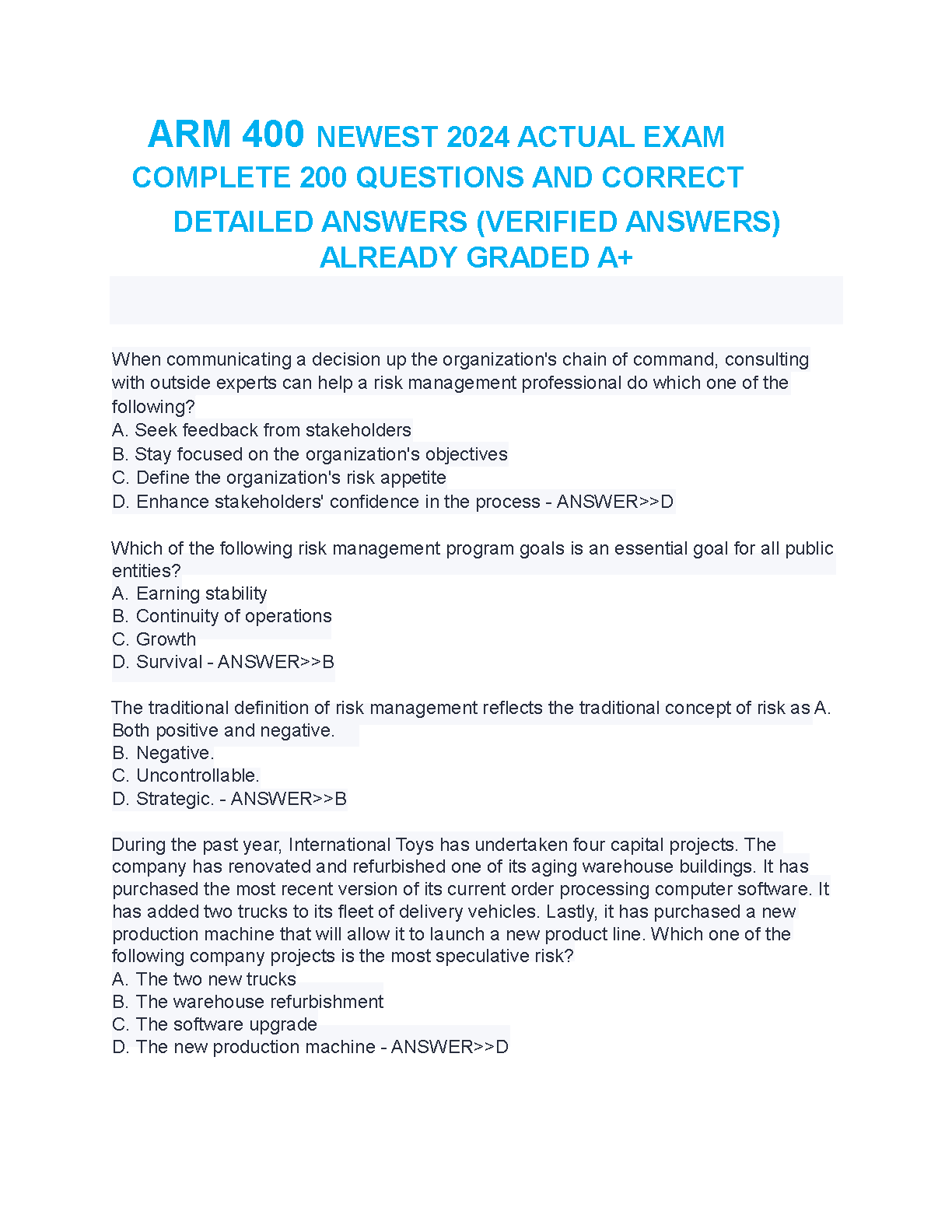 Ace your ARM 400 exam on the first try with this comprehensive 2024 edition study guide. This resource contains 200 detailed questions and verified answers, already graded A+, designed to help students master the material and avoid resits. Prepare thoroughly and confidently for exam success.