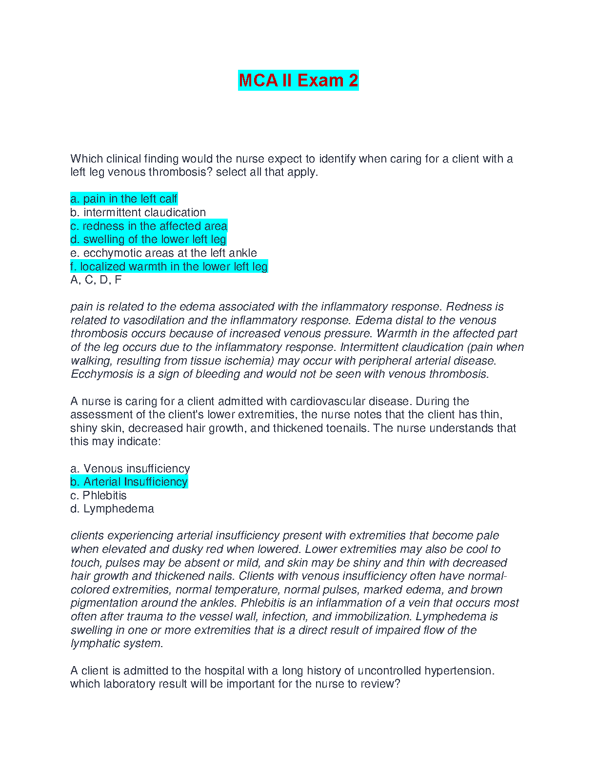 MCA II Exam 2: Venous Thrombosis and Cardiovascular Disease - Practice Questions for Nursing Students