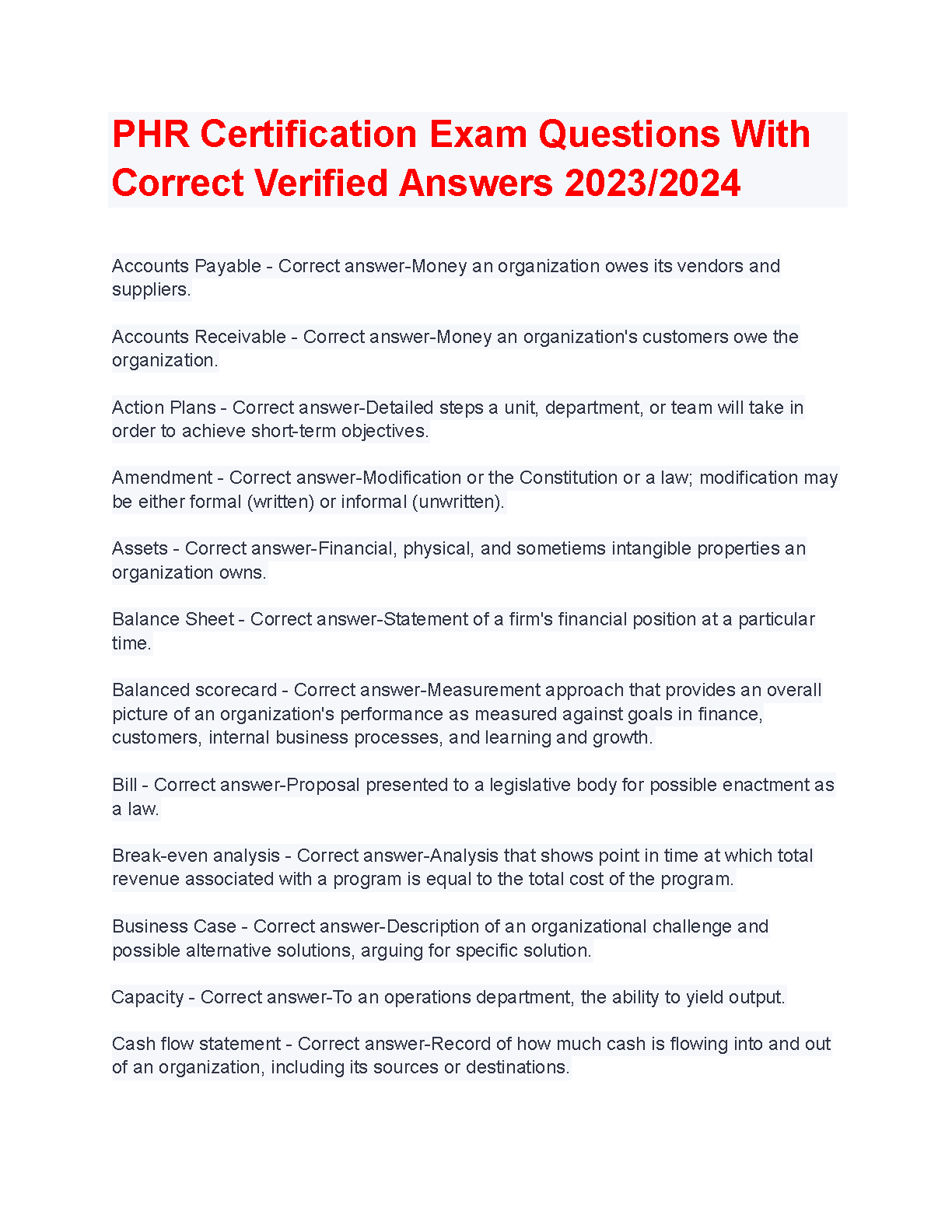 Ace your PHR certification exam on the first try with this comprehensive guide containing verified answers to key exam questions. Ideal for 2024/2025 academic y...