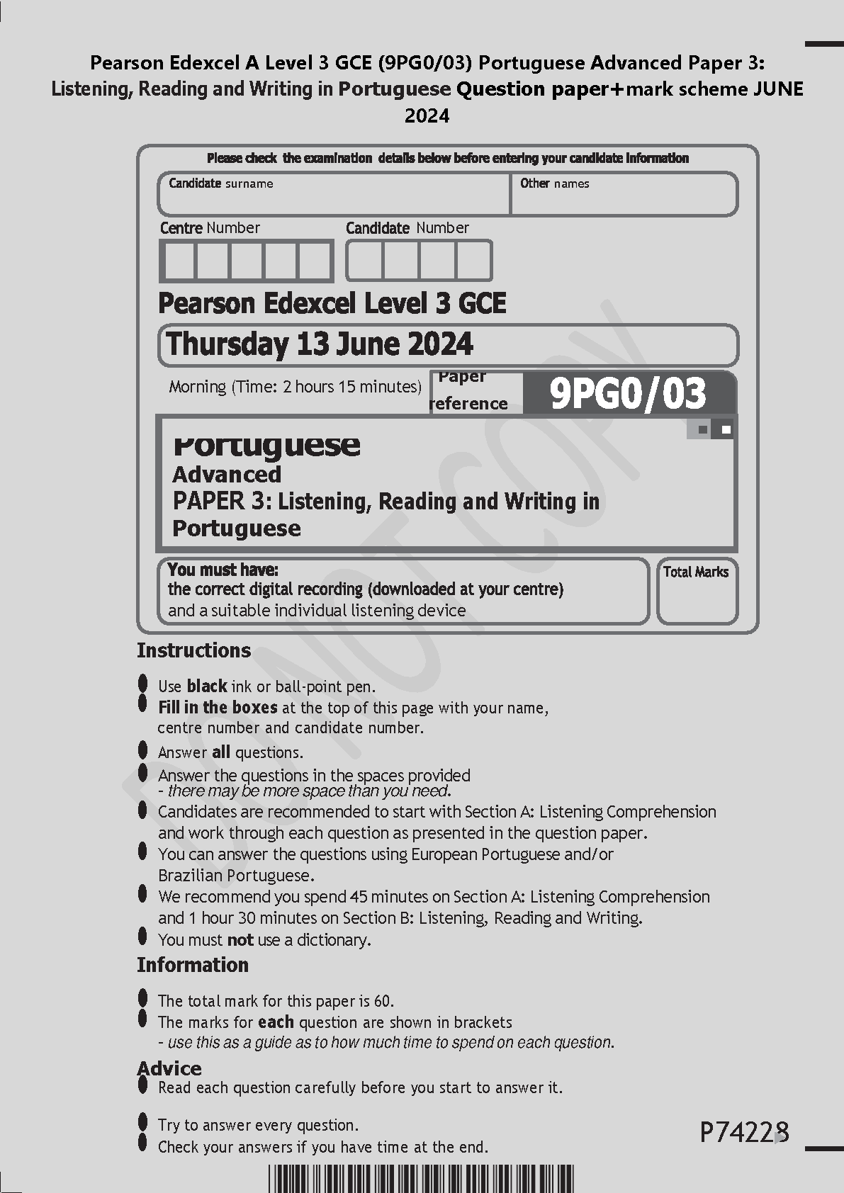 Pearson Edexcel A Level 3 GCE (9PG0/03) Portuguese Advanced Paper 3: Listening, Reading and Writing in Portuguese Question Paper + Mark Scheme June 2024