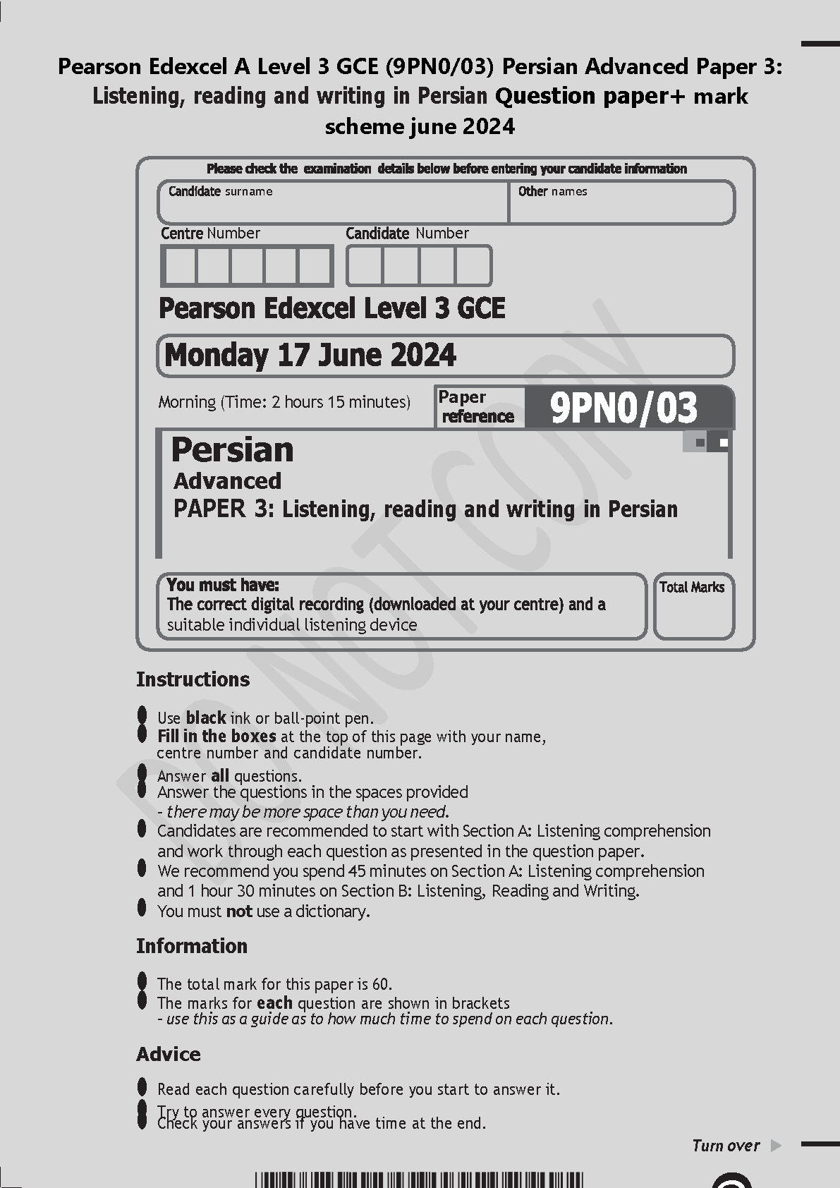 Pearson Edexcel A Level 3 GCE (9PN0/03) Persian Advanced Paper 3: Listening, Reading and Writing in Persian - June 2024 Question Paper + Mark Scheme