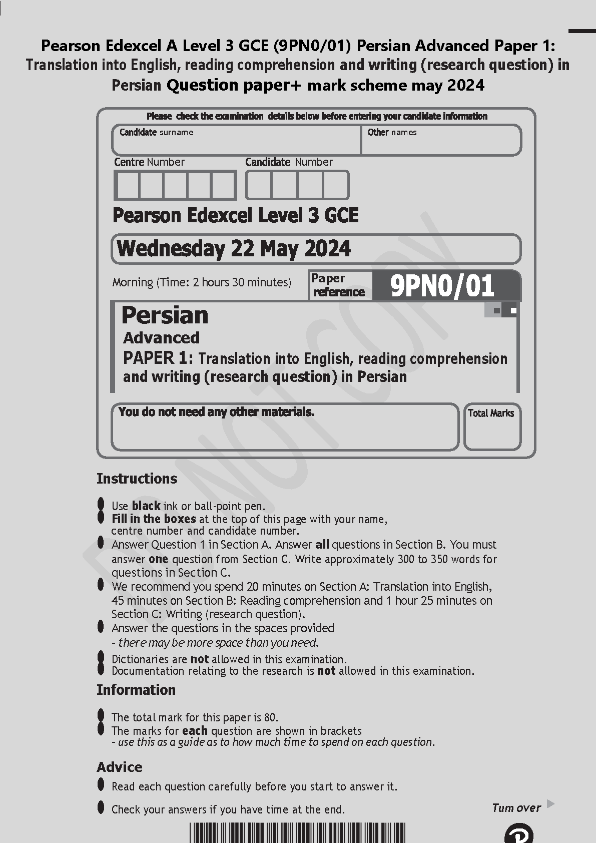 Pearson Edexcel A Level 3 GCE (9PN0/01) Persian Advanced Paper 1: 2024 Edition - Translation, Reading Comprehension, and Writing (Research Question)