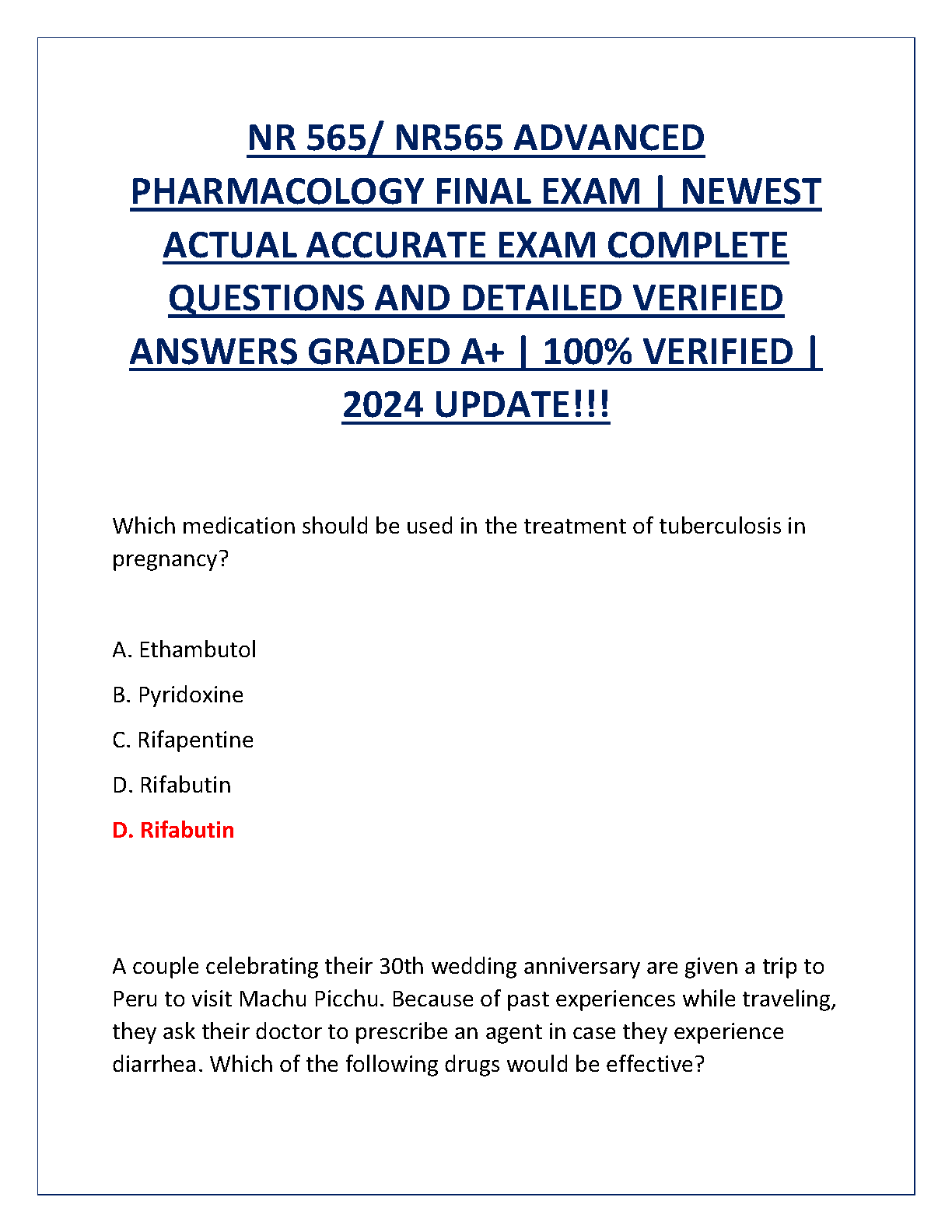 Ace your NR 565/NR565 Advanced Pharmacology final exam with this comprehensive 2024 edition study guide. Featuring actual, accurate exam questions and detailed, verified answers graded A+, this resource is designed to help you pass on your first attempt and avoid resits. 100% verified for accuracy and updated for the latest curriculum.