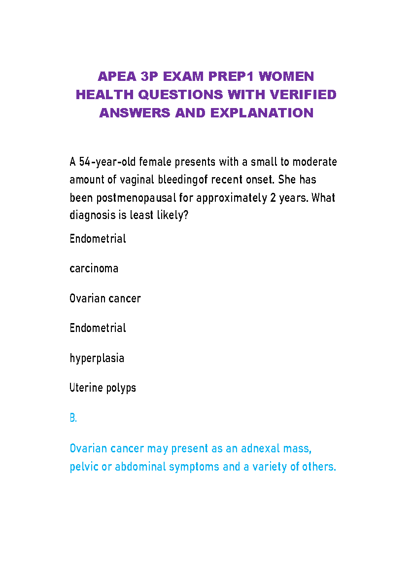 Ace your APEA 3P exam on the first try with this comprehensive prep material covering women's health. This resource provides verified answers and explanations t...
