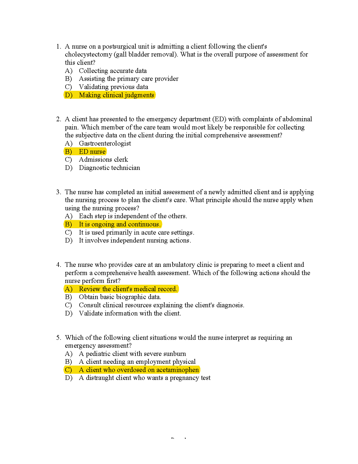 Ace your nursing exams on the first attempt with this comprehensive set of practice questions, designed to cover key assessment concepts. These questions are perfect for students preparing for their nursing school exams in 2024/2025. Prepare effectively, avoid resits, and boost your confidence!