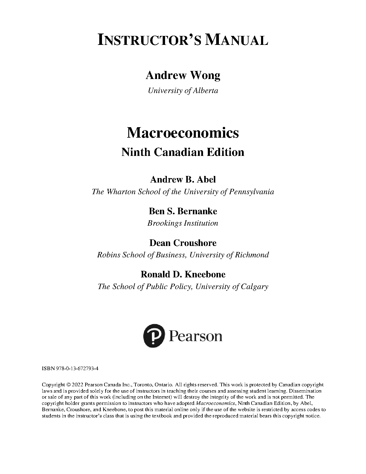 Macroeconomics Ninth Canadian Edition Instructor's Manual by Andrew B. Abel, Ben S. Bernanke, Dean Croushore, Ronald D. Kneebone, and Andrew Wong