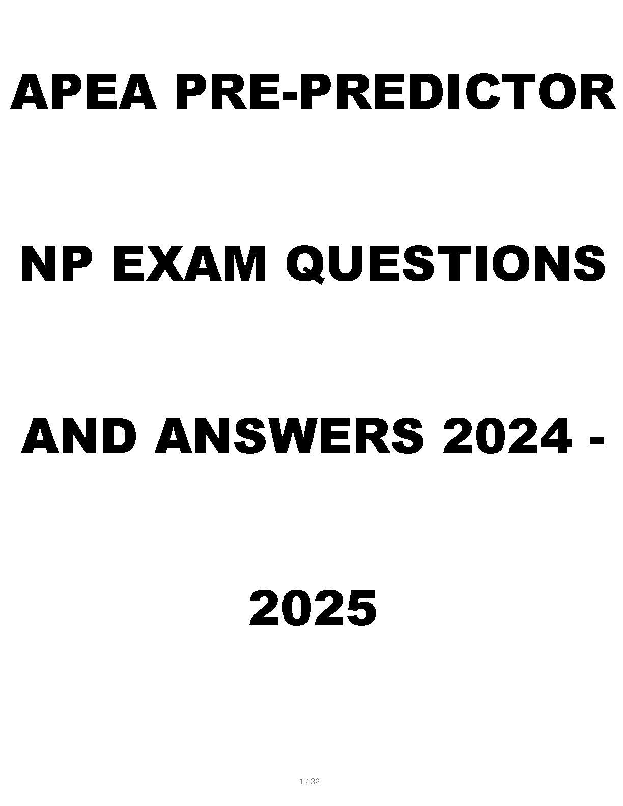 This comprehensive resource contains APEA Pre-Predictor NP exam questions and answers for the 2024-2025 academic year. Designed to help nursing students prepare effectively and avoid exam resits, this guide covers a wide range of topics to ensure exam readiness. Prepare thoroughly and confidently pass your APEA exam.