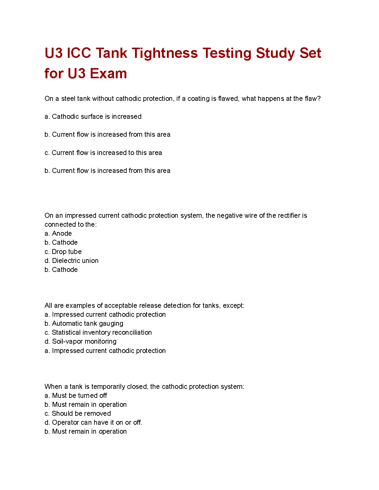 Prepare for your U3 ICC Tank Tightness Testing exam with this in-depth study set. This resource is designed to help students master the material and pass their exams on the first attempt. Topics include cathodic protection, release detection, and more. Get ready for success!