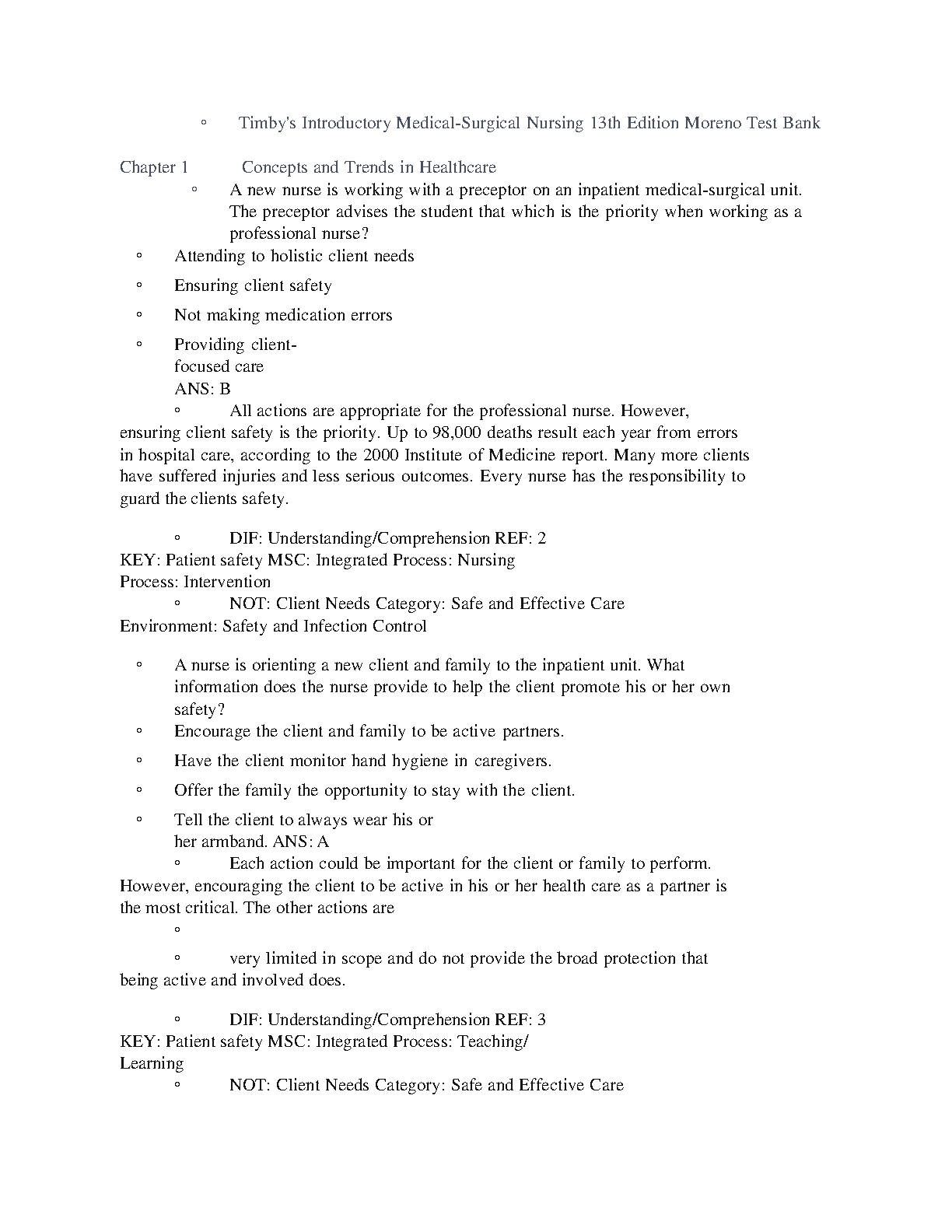This comprehensive test bank for Timby's Introductory Medical-Surgical Nursing, 13th Edition, by Barbara Timby and Nancy J. Smith, is your ultimate resource for exam success in the 2024/2025 academic year. Prepare thoroughly and confidently, maximizing your chances of passing on the first attempt. Detailed questions and answers cover key concepts, ensuring a strong understanding of medical-surgical nursing principles.