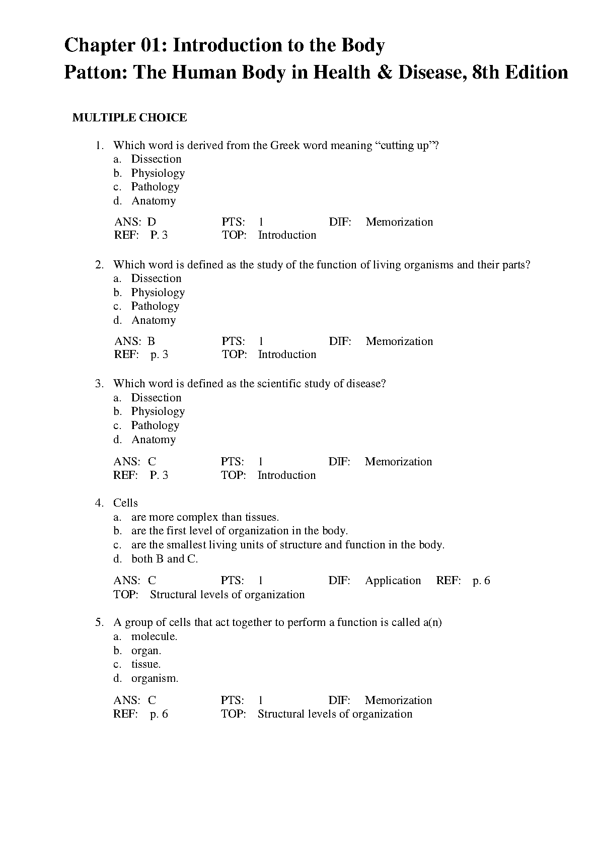 Patton & Thibodeau's The Human Body in Health & Disease, 8th Edition: Test Bank