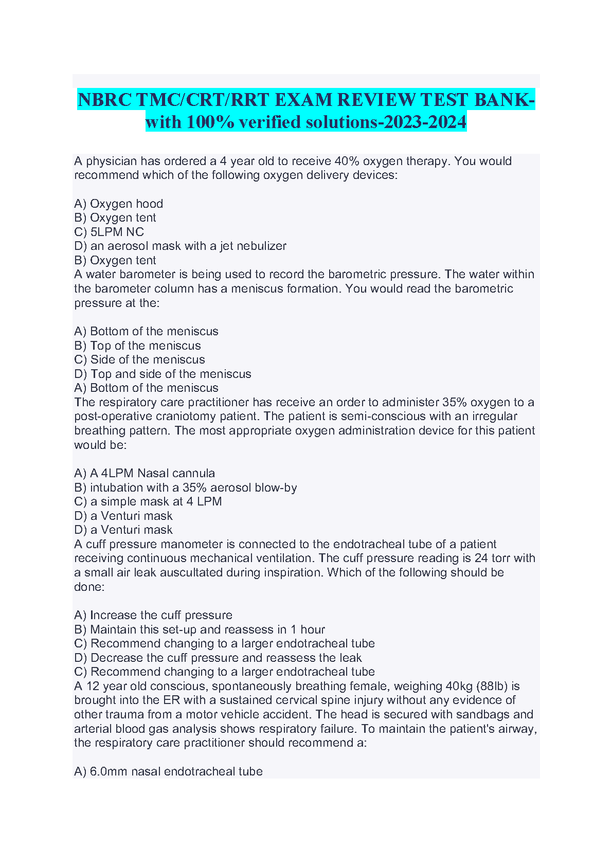 Ace your NBRC TMC/CRT/RRT exam with this comprehensive test bank featuring 100% verified solutions for the 2023-2024 academic year. This resource is designed to help students master the material and avoid resits, ensuring exam success.