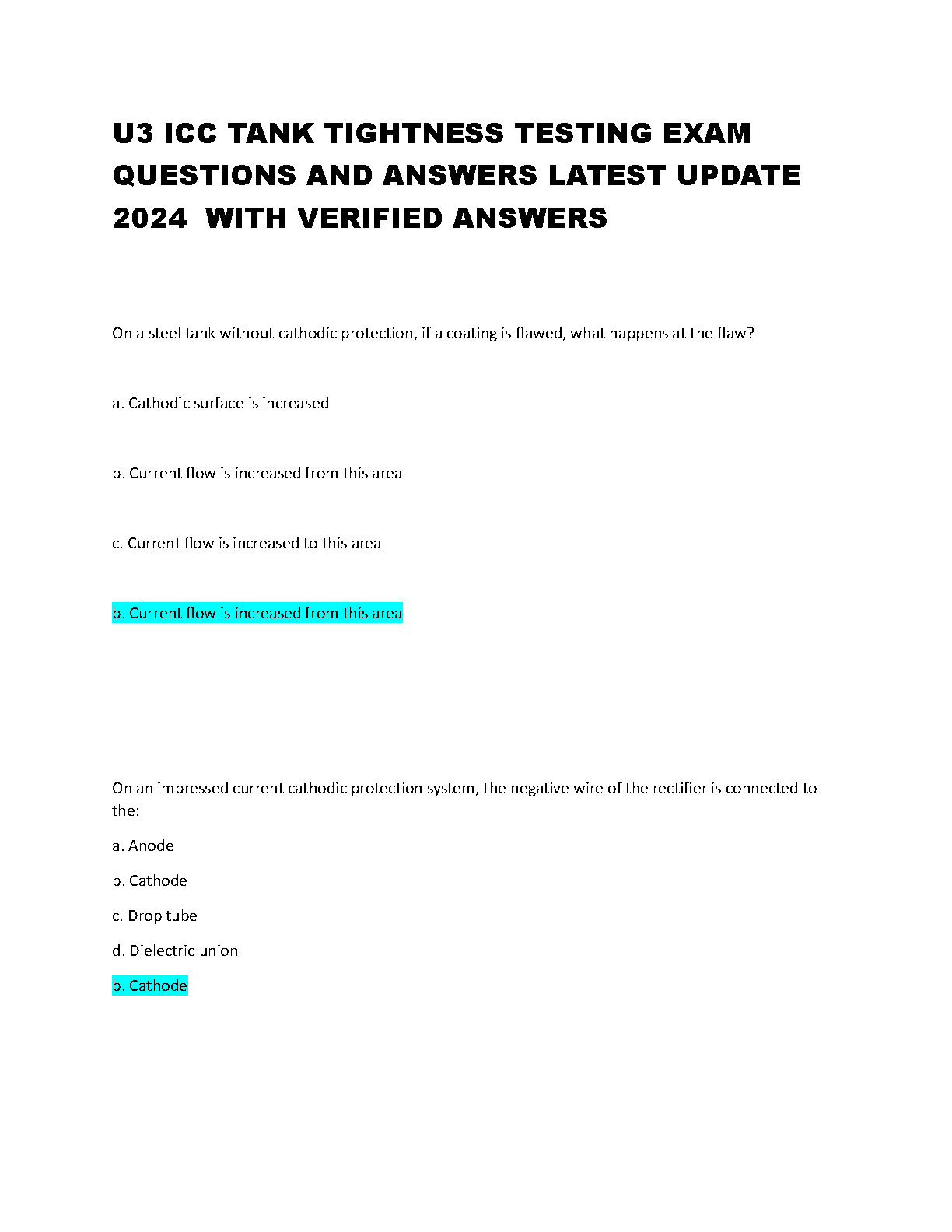U3 ICC Tank Tightness Testing Exam Questions and Answers 2024: Verified Solutions for First-Attempt Exam Success