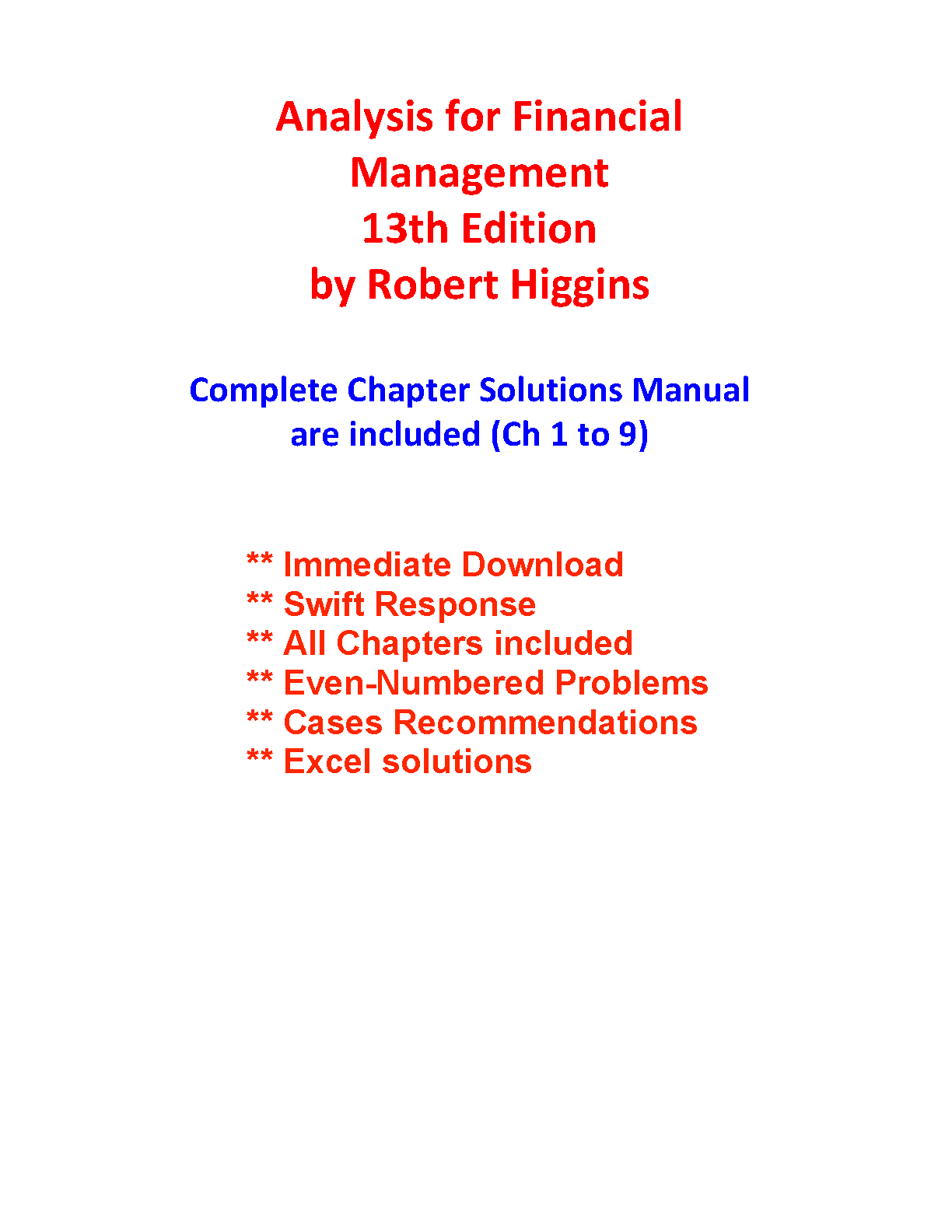 Get instant access to the complete solutions manual for Robert Higgins' Analysis for Financial Management, 13th Edition. This comprehensive resource includes solutions for all chapters (1-9), even-numbered problems, case recommendations, and Excel solutions. Guaranteed to help you master the material and achieve exam success on your first try! Download now and avoid resits!