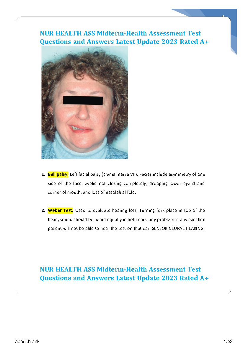 Guaranteed to help you pass your NUR HEALTH ASS Midterm exam on your first attempt. This comprehensive guide includes questions and answers with the latest upda...