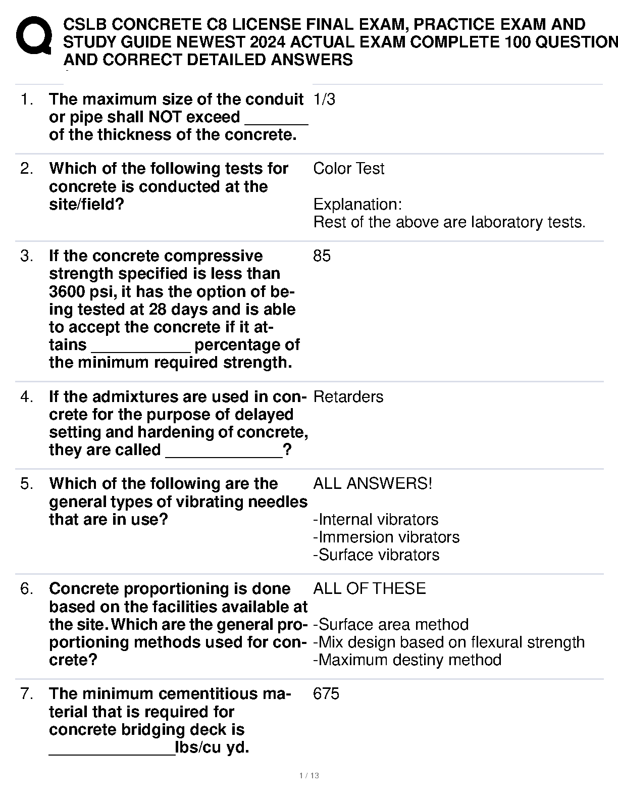 CSLB Concrete C8 License Final Exam Study Guide: Newest 2024 Edition - 100 Questions & Answers