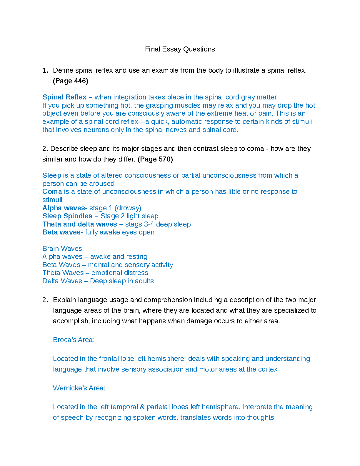 Prepare for success in your upcoming exams with these meticulously crafted final essay questions. This comprehensive resource covers key topics, including spinal reflexes, sleep stages, and language comprehension. Designed to help students master the material and achieve exam mastery on their first attempt, avoiding resits. Get ahead of the curve and boost your confidence!