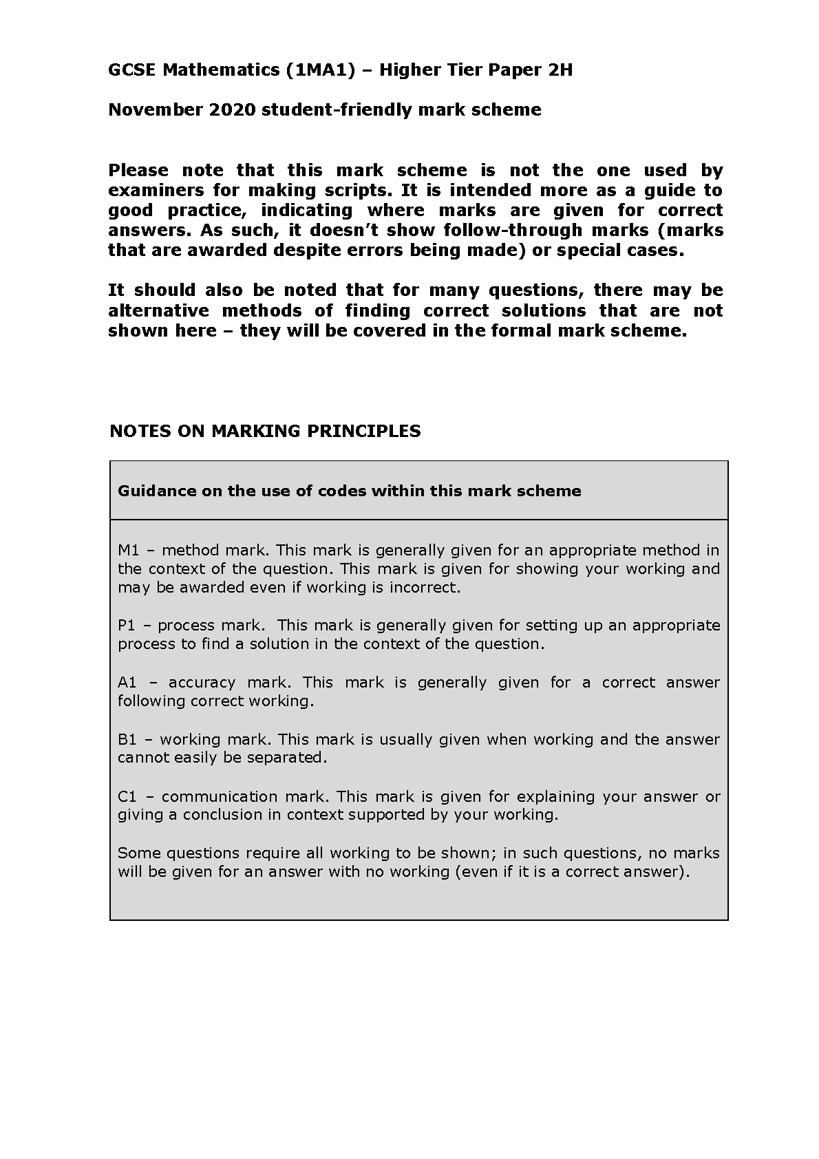 GCSE Mathematics (1MA1) Higher Tier Paper 2H November 2020 Student-Friendly Mark Scheme