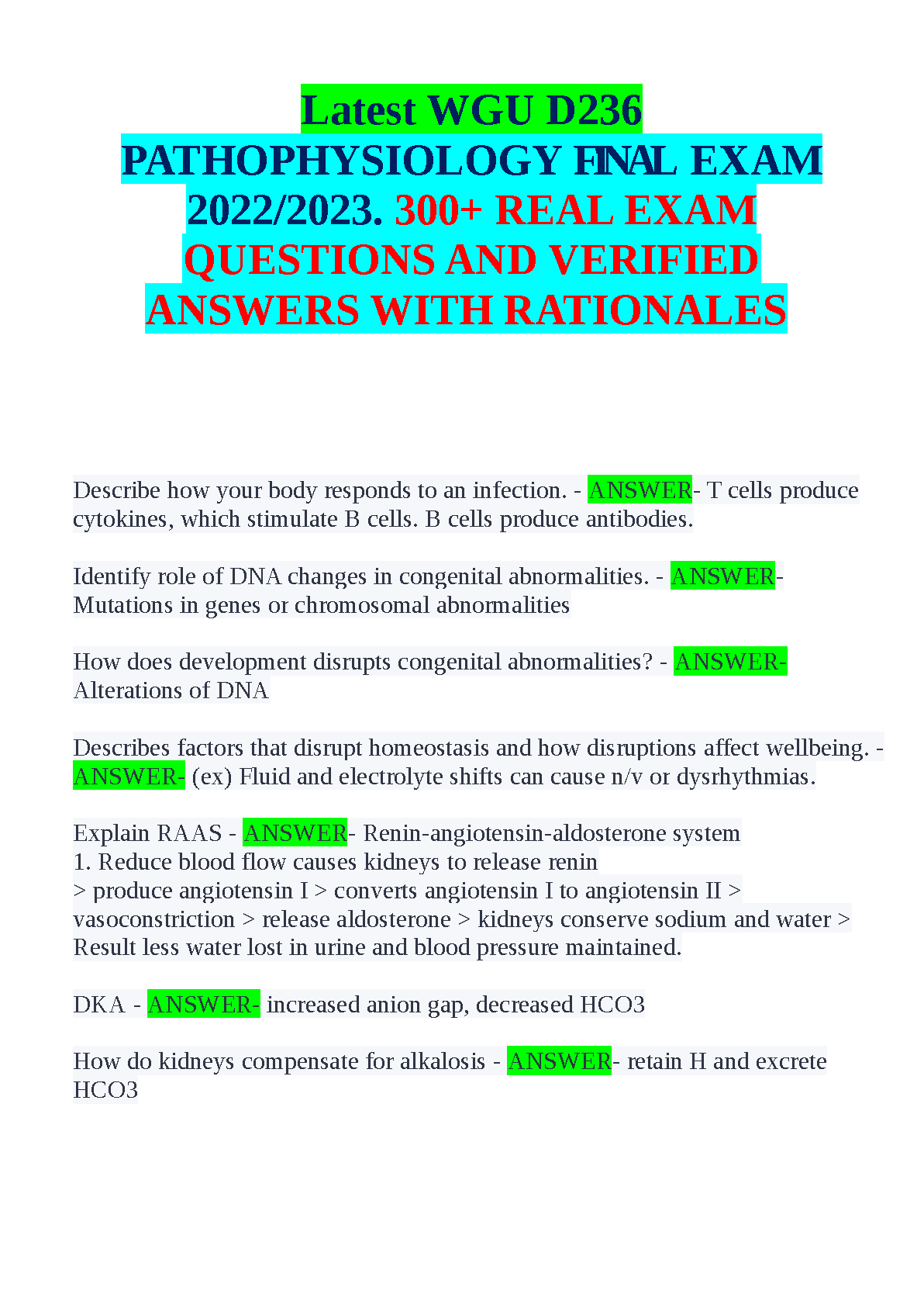 Ace your WGU D236 Pathophysiology final exam with this comprehensive study resource. Featuring 300+ real exam questions and verified answers with rationales, th...