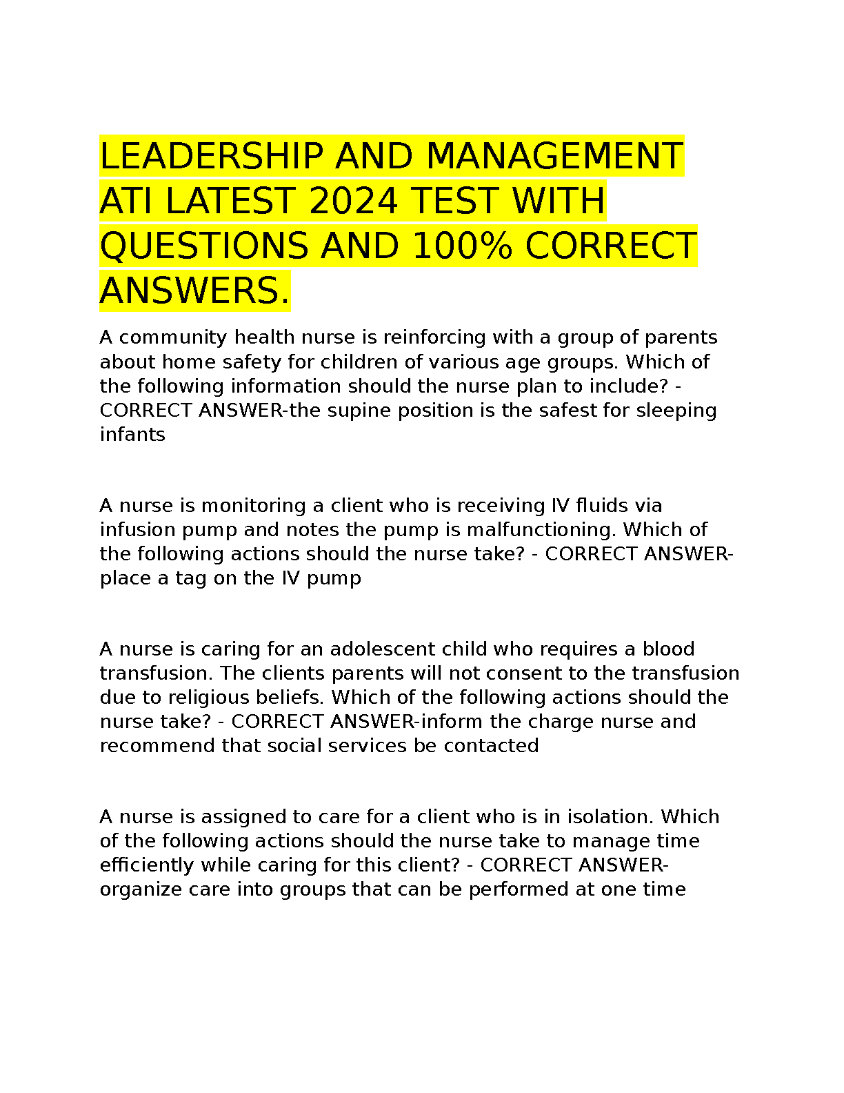Ace your ATI Leadership and Management exam with this comprehensive 2024 test bank. Featuring hundreds of questions and 100% verified answers, this resource is designed to help nursing students pass their exams on the first try and avoid costly resits. Prepare effectively for success!