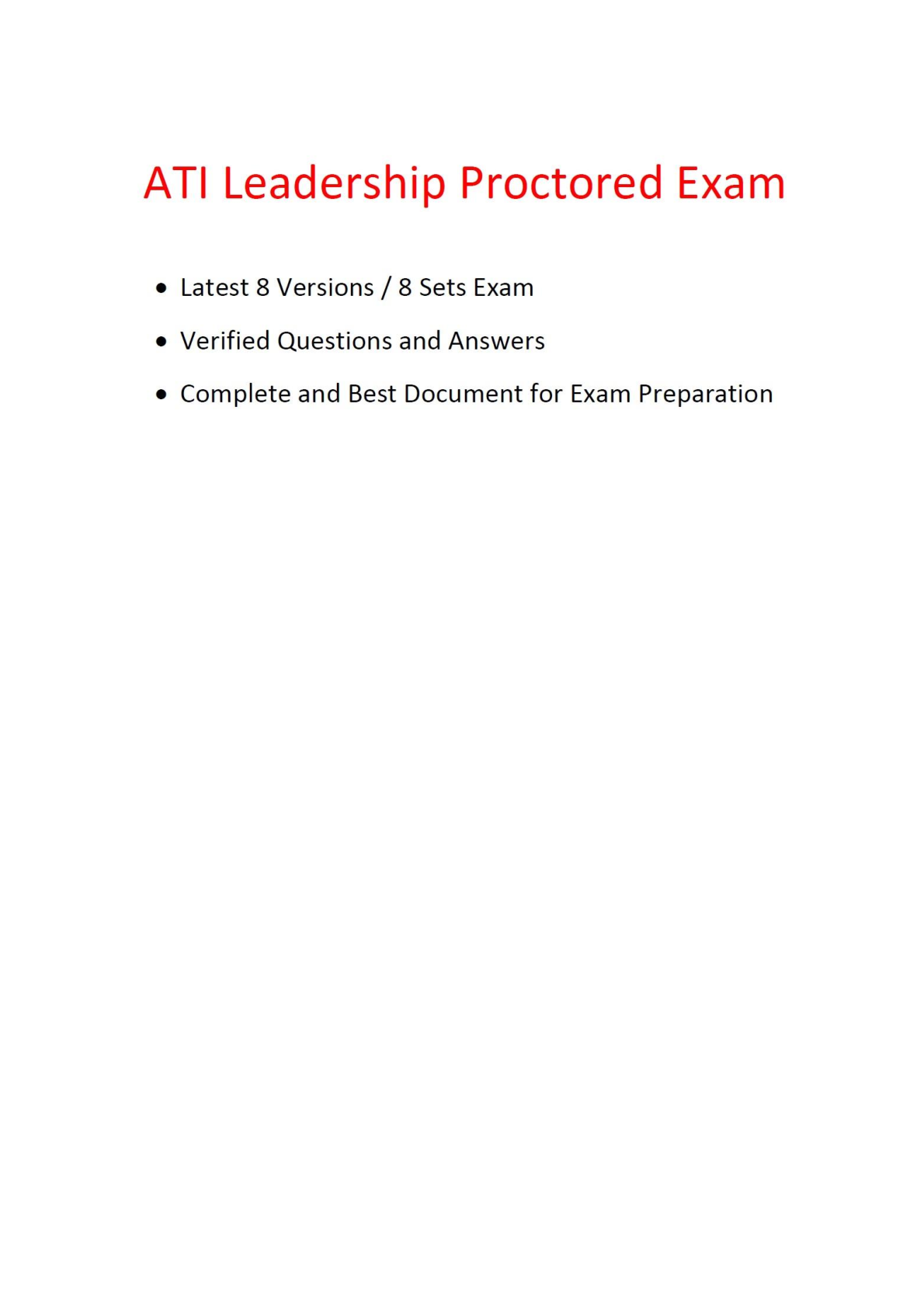 Ace your ATI Leadership Proctored Exam on the first try with this comprehensive study guide. This resource contains the latest 8 versions of the exam, featuring verified questions and answers to ensure complete exam preparation. Avoid resits and achieve your academic goals with this essential resource.