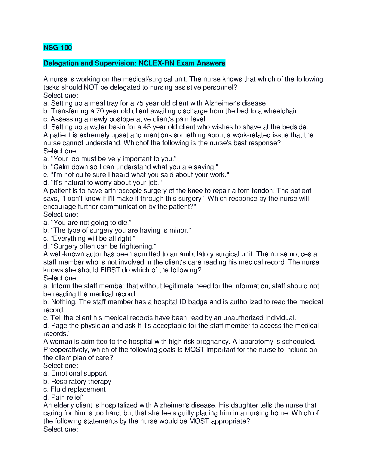 NSG 100 Delegation and Supervision: NCLEX-RN Exam Answers - 2024/2025 Edition
