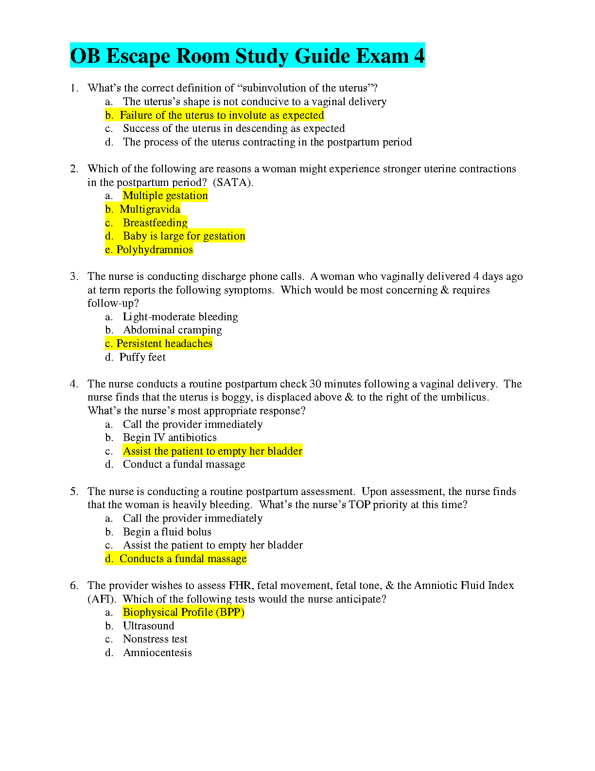 OB Escape Room Study Guide Exam 4: Ace Your Postpartum Nursing Exam with This 2024/2025 Study Guide