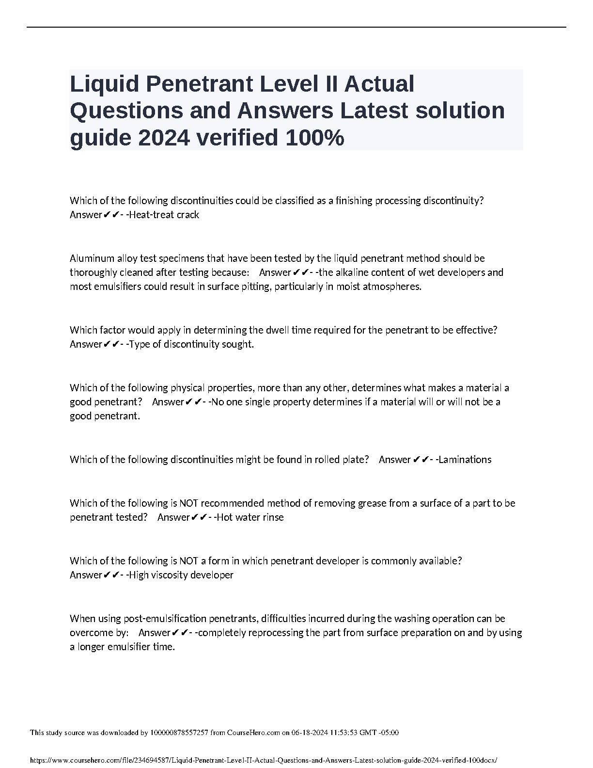 2024/2025 Liquid Penetrant Level II Actual Questions and Answers: Exam Prep Guide for First-Time Pass