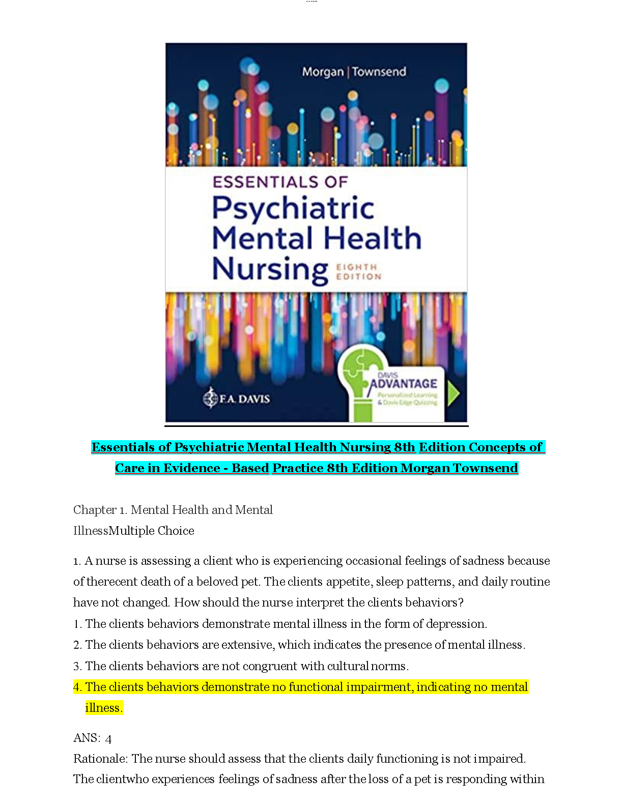 This comprehensive test bank for Morgan and Townsend's Essentials of Psychiatric Mental Health Nursing, 8th Edition, provides a wealth of practice questions to...