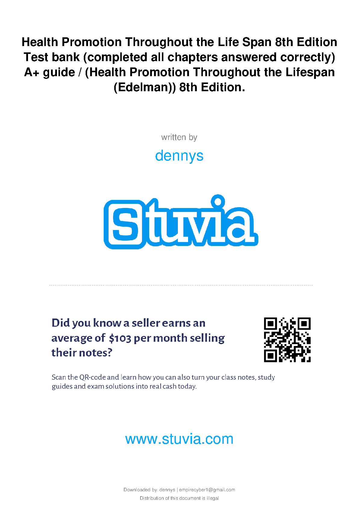 Ace your Health Promotion Throughout the Lifespan exam with this comprehensive 8th edition test bank. All chapters are completed with correctly answered questions, providing an A+ study guide to help you pass on your first attempt. Avoid resits and achieve exam excellence!