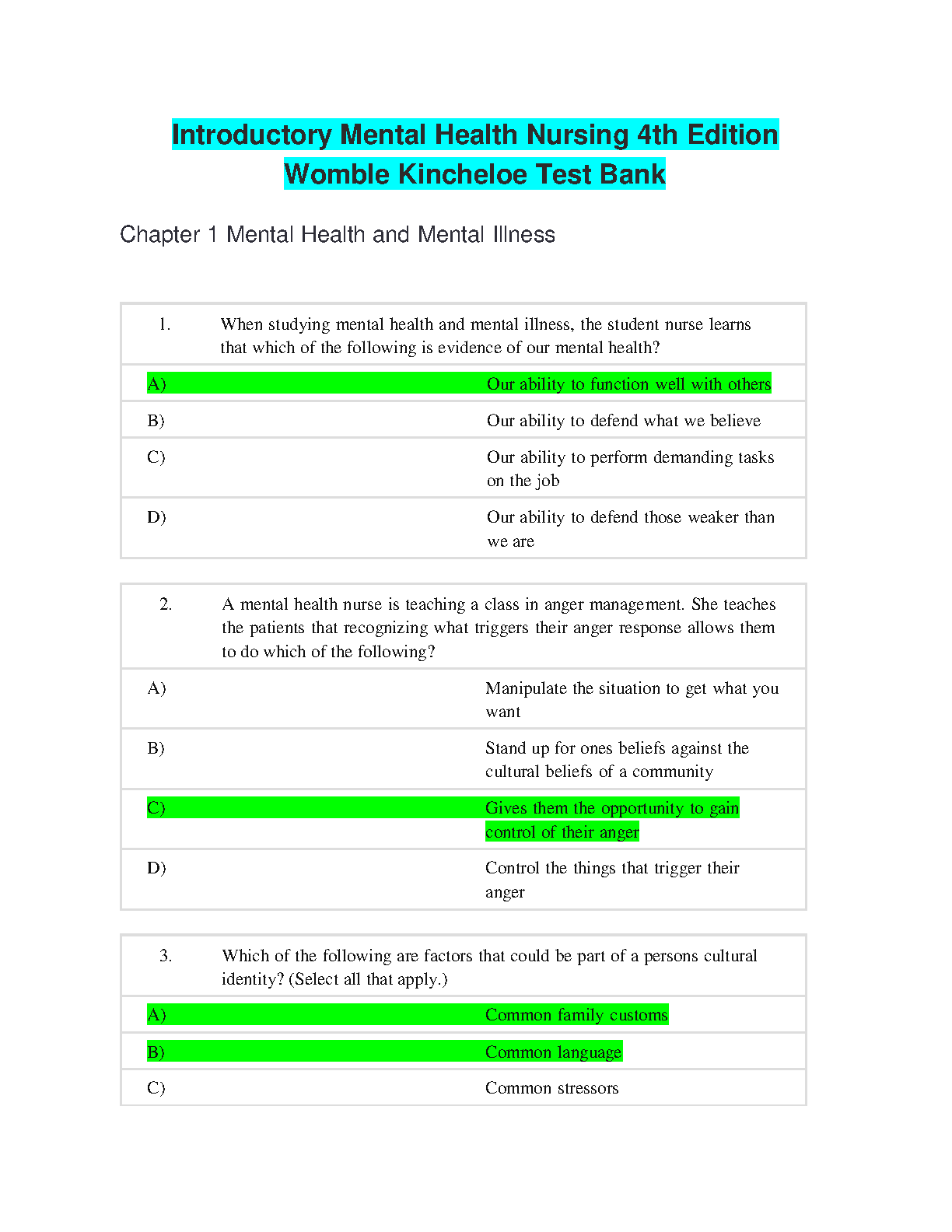 Prepare for success in your mental health nursing course with this comprehensive test bank for Womble and Kincheloe's Introductory Mental Health Nursing, 4th Edition. This resource provides practice questions and answers, helping you master key concepts and confidently tackle exams, avoiding resits. Perfect for 2024/2025 academic year.