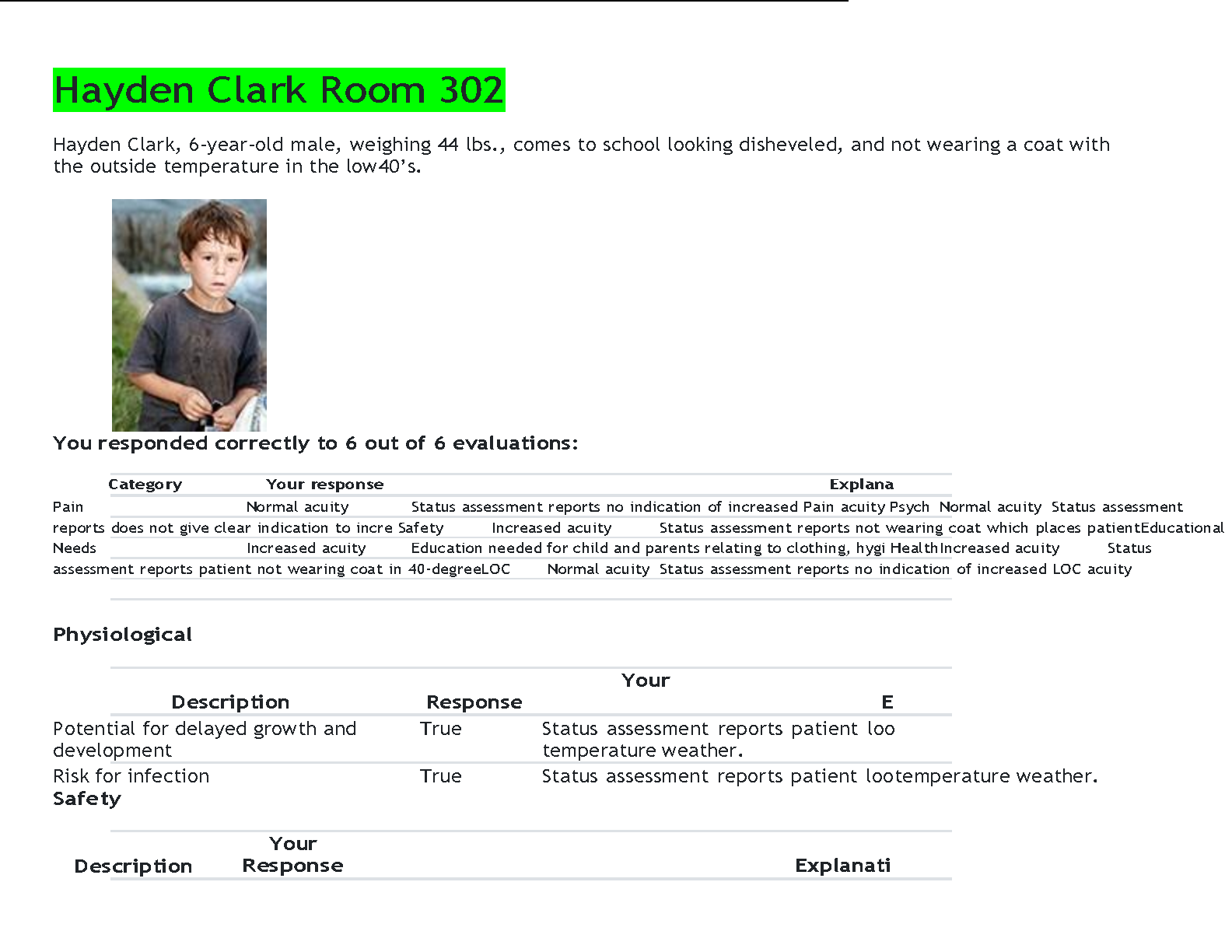This detailed case study presents the scenario of Hayden Clark, a 6-year-old male weighing 44 lbs., who arrives at school disheveled and without a coat in cold weather. Analyze the potential risks, assess the patient's needs, and determine the appropriate course of action. Perfect for students aiming to pass exams on their first attempt. This resource provides a realistic case study designed for 2024-2025 academic year success.