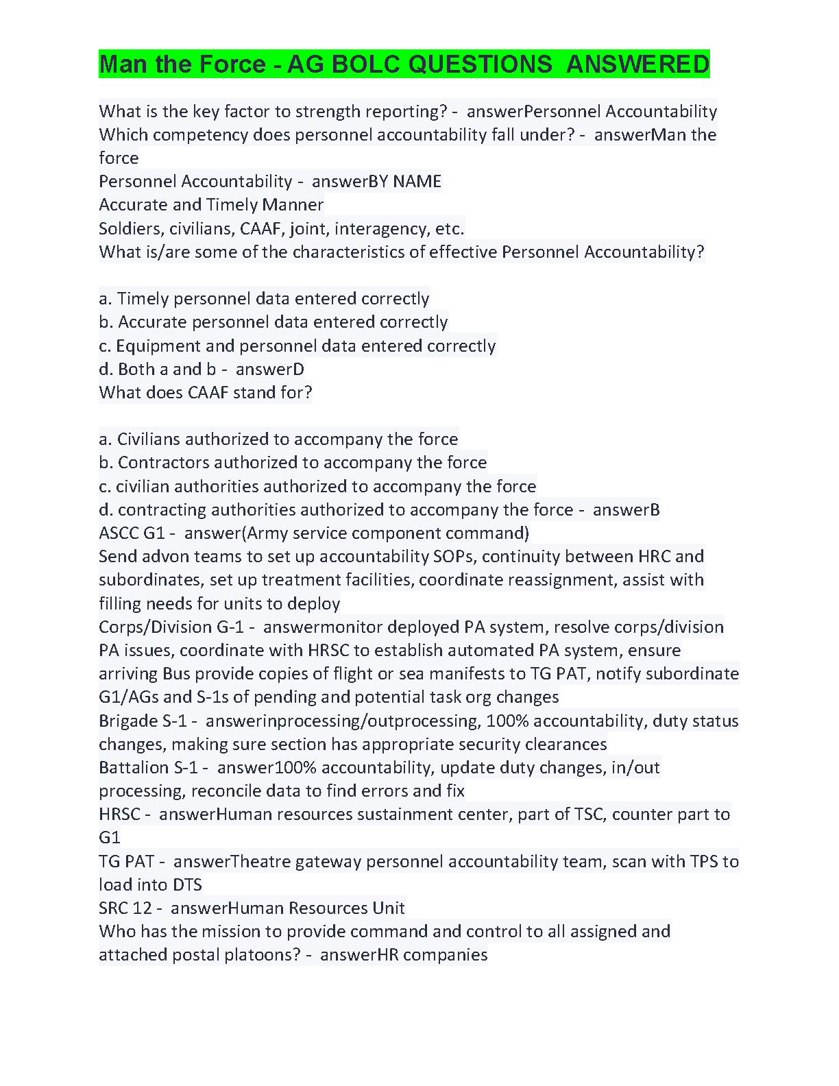 Ace your exams on the first try! This essential resource provides comprehensive answers to key Man the Force AG BOLC questions, covering personnel accountabilit...