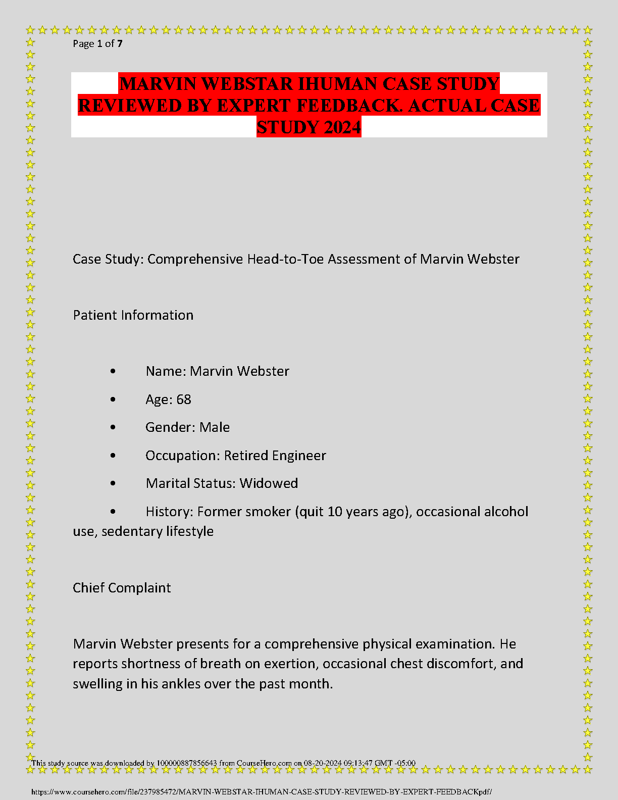 Ace your iHuman exams with this detailed 2024 case study of Marvin Webster. This expertly reviewed resource provides a comprehensive head-to-toe assessment, covering patient history, chief complaints, and more. Perfect for first-attempt exam success and avoiding resits.