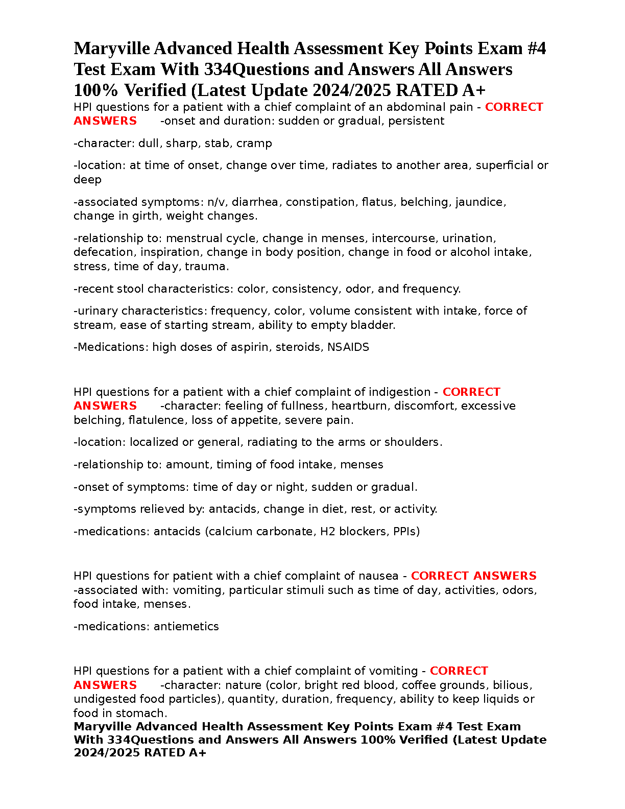 Ace your Maryville Advanced Health Assessment Exam with this comprehensive test bank featuring 334 questions and answers. This 2024/2025 updated resource is 100% verified and guarantees a top grade, helping you avoid resits and pass on your first attempt. Covers key topics including abdominal pain, indigestion, nausea, and vomiting.