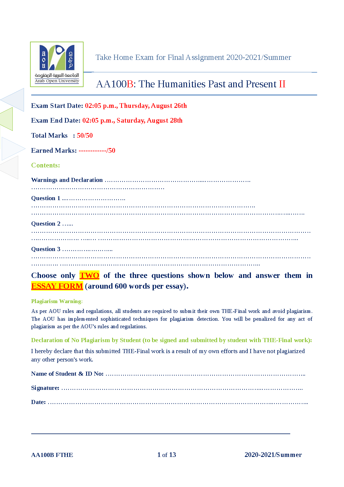 This resource contains a take-home exam for the AA100B: The Humanities Past and Present II course, covering the 2020-2021 summer semester. The exam includes thr...