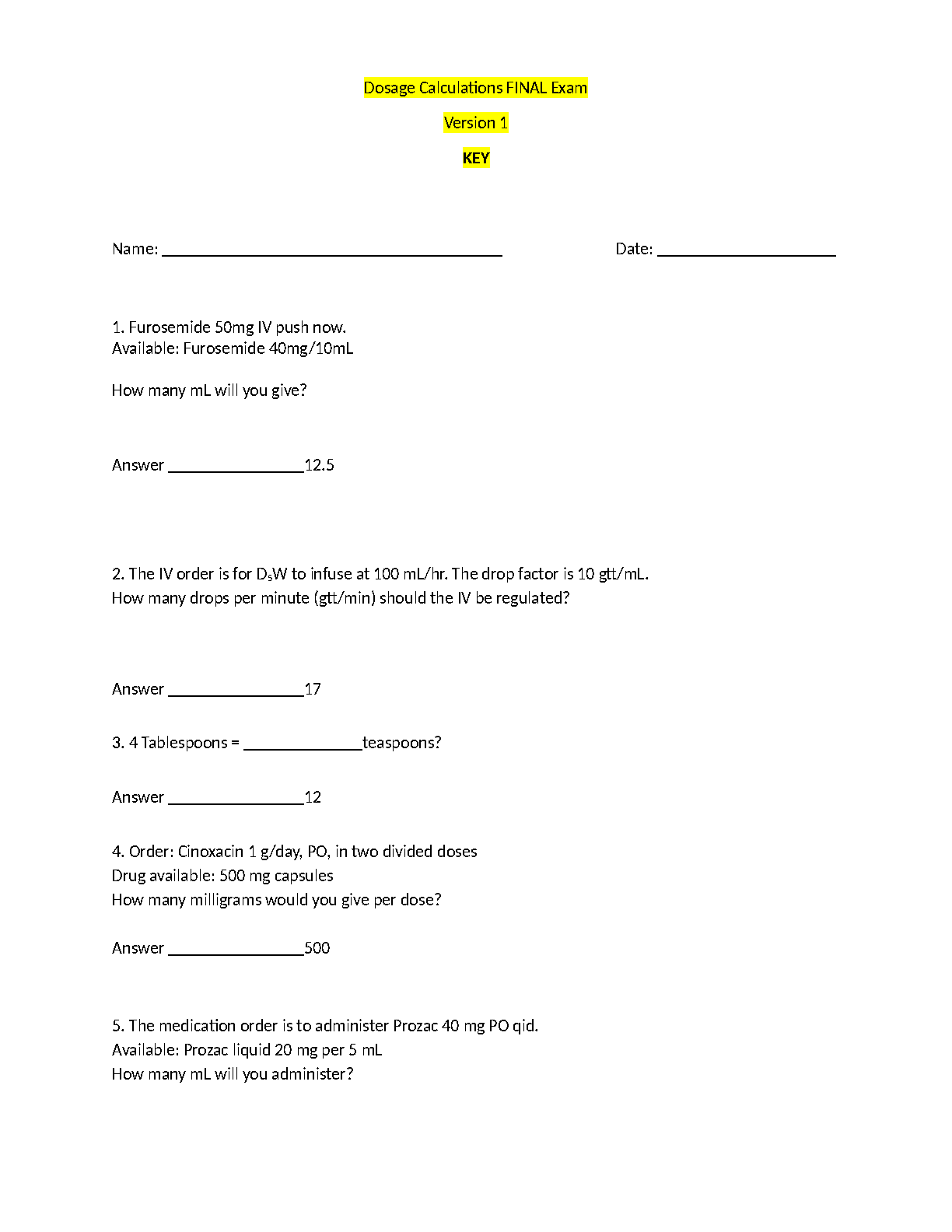 Dosage Calculations FINAL Exam: Version 1 - Practice Questions and Answers