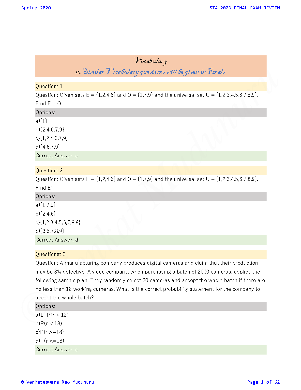 Ace your STA 2023 final exam with this complete review guide, meticulously crafted by Venkateswara Rao Mudunuru. This resource covers key concepts, including vocabulary, set theory, and probability, with detailed explanations and practice problems to ensure you master the material and pass on your first attempt. Prepare for success and avoid resits!