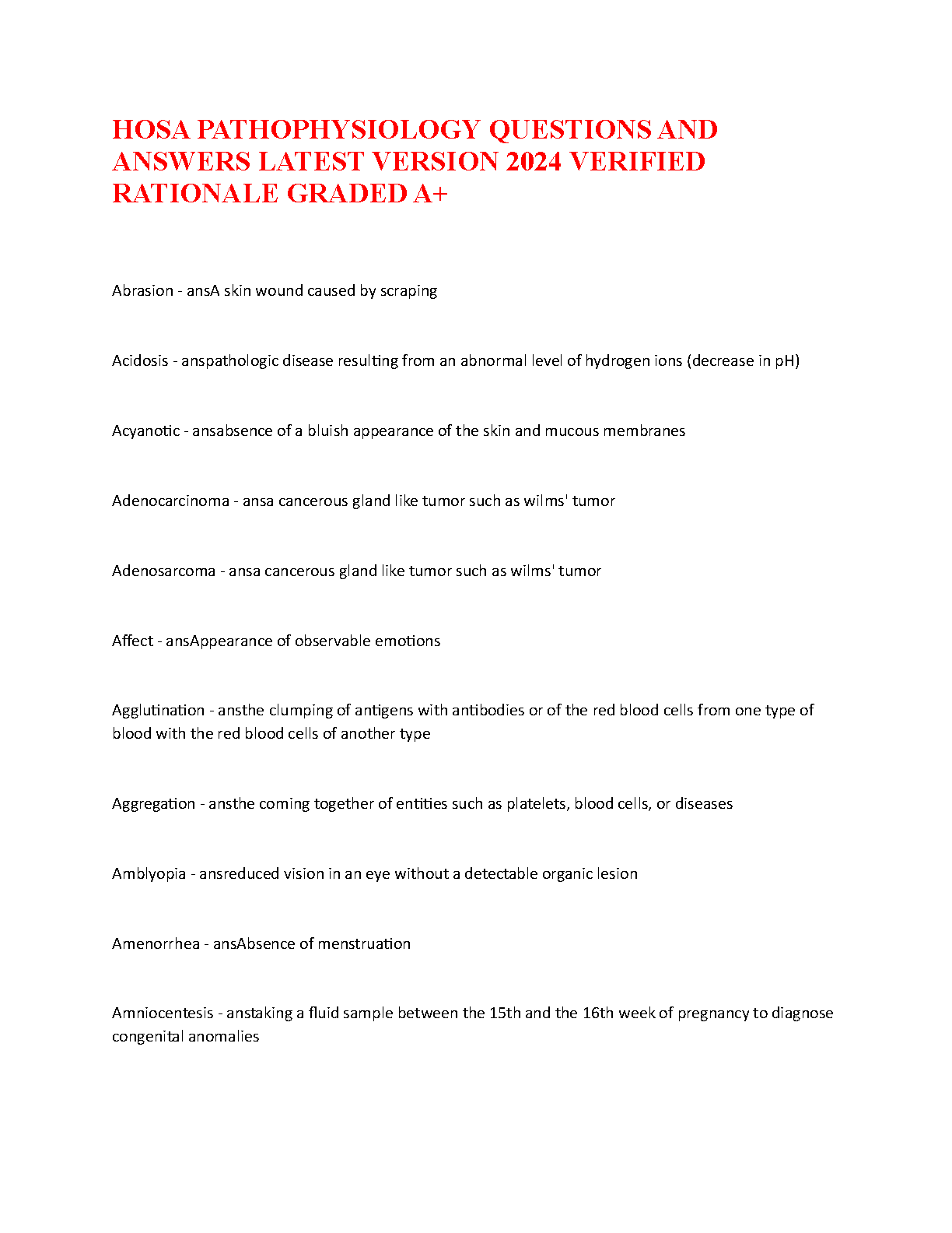 Ace your HOSA Pathophysiology exams with this comprehensive question bank. This latest 2024 version includes verified answers and detailed rationales, ensuring...