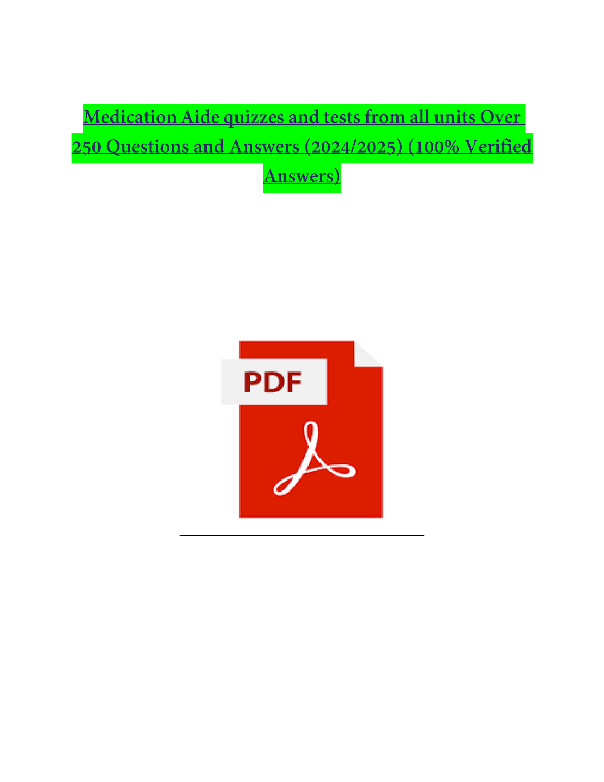 Ace your Medication Aide exam on the first try with this comprehensive study guide. This resource contains over 250 verified questions and answers covering all units, providing a complete review for the 2024/2025 academic year. Ensure exam success and avoid resits with this 100% verified resource.