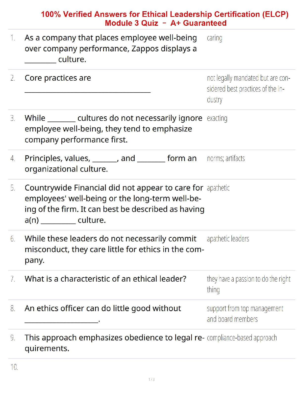 100% Verified Answers for Ethical Leadership Certification (ELCP) Module 3 Quiz - A+ Guaranteed