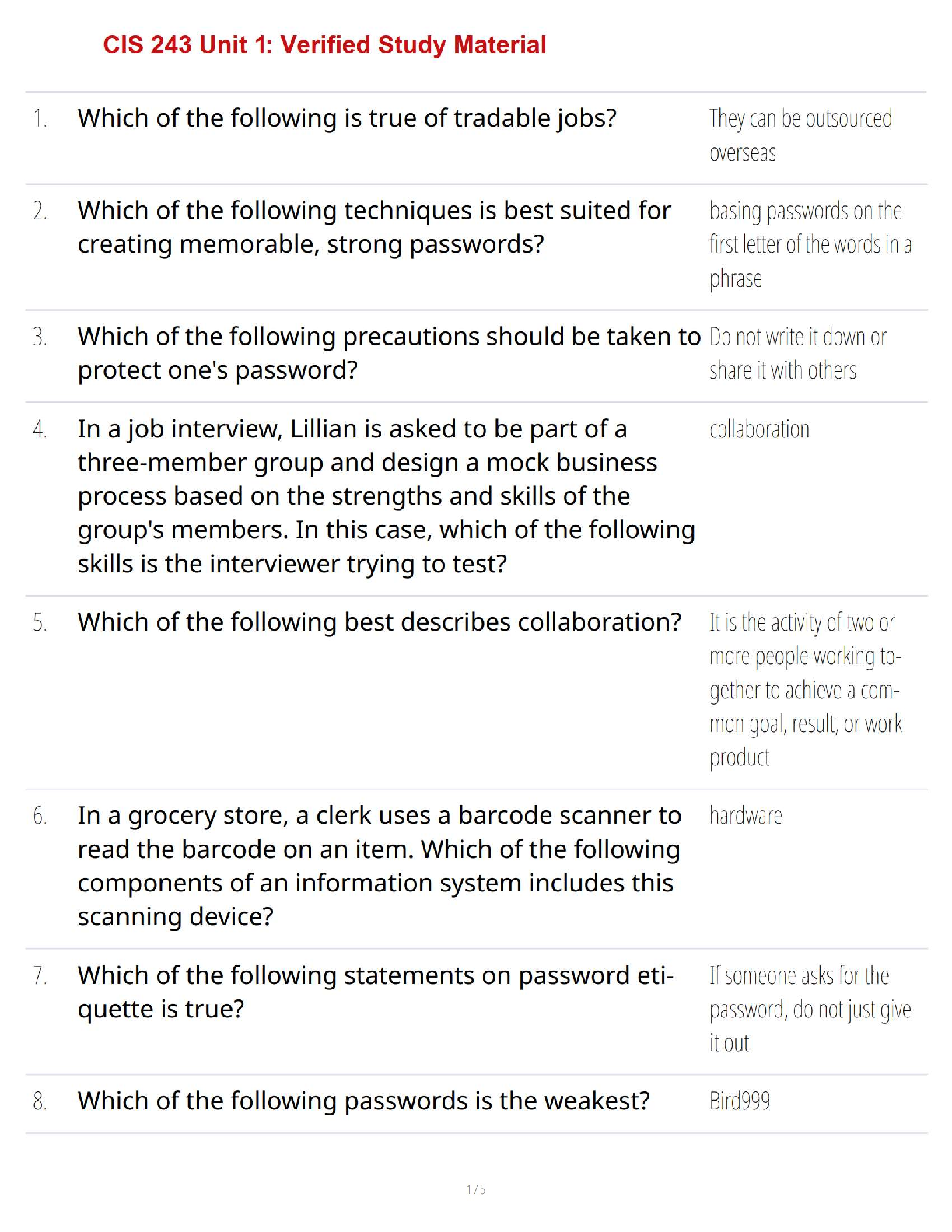 This comprehensive study guide for CIS 243 Unit 1 is designed to help students master the key concepts and pass their exams on the first try. Prepare for success in the 2024-2025 academic year with this verified study material covering topics like tradable jobs, password security, collaboration, and information systems.