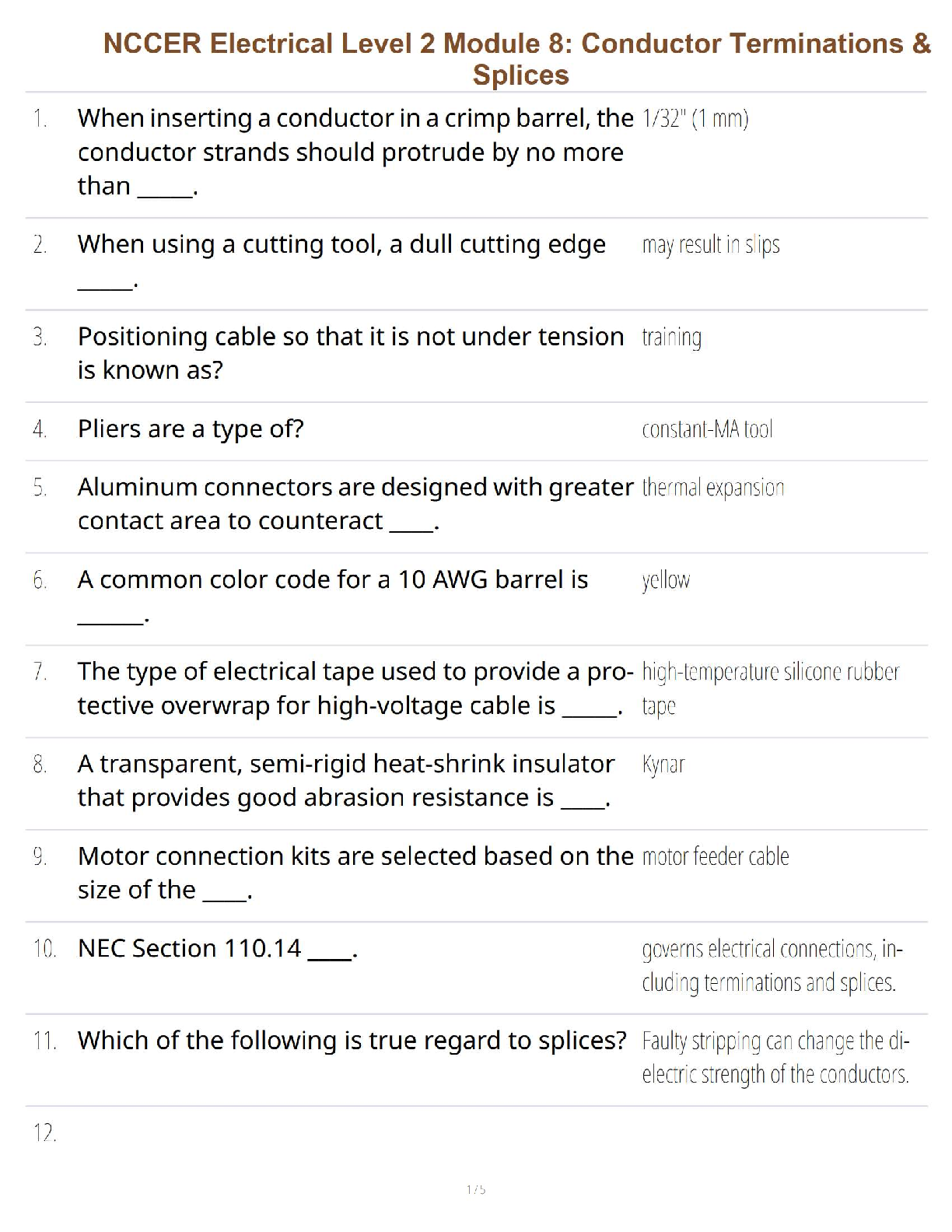 NCCER Electrical Level 2 Module 8: Conductor Terminations & Splices - Practice Questions for 2024/2025