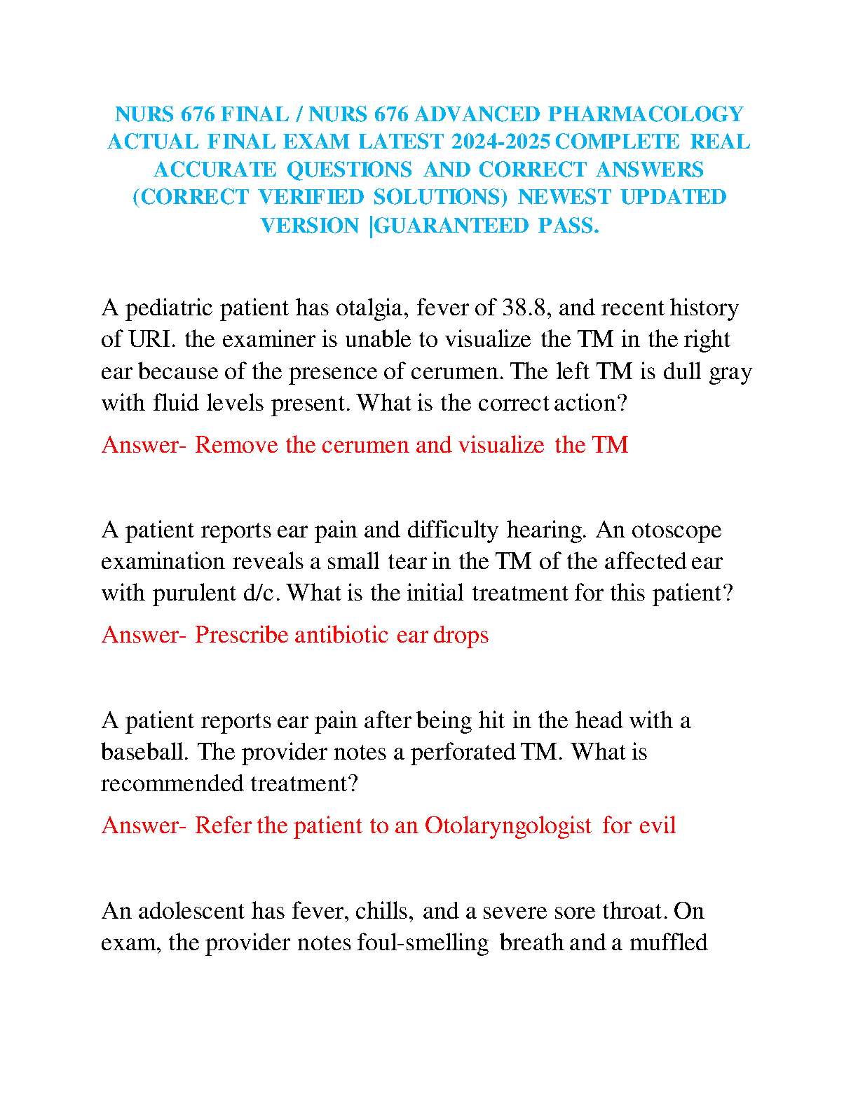 Ace your NURS 676 Advanced Pharmacology final exam with this comprehensive guide featuring accurate, verified solutions for the 2024-2025 academic year. Guaranteed to help you pass on your first attempt, avoiding resits. This resource contains real exam questions and answers, covering key concepts to boost your exam confidence.